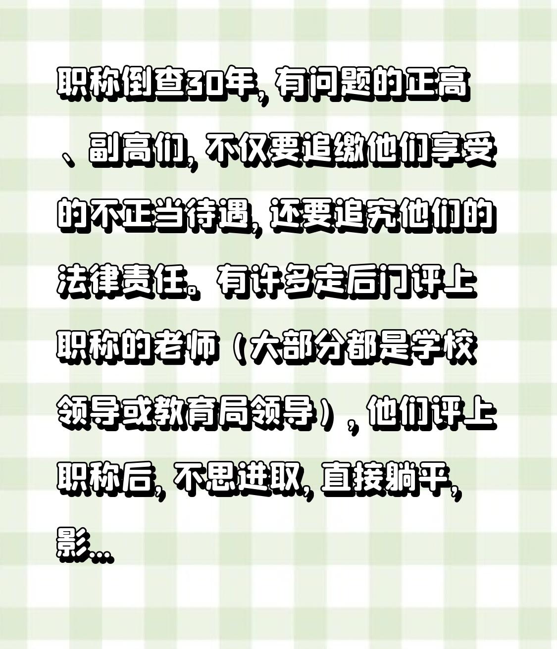 职称倒查30年,有问题的正高、副高们,不仅要追缴他们享受的不正当待遇,还要追究他们的法律责任。 有许多走后门评上职称的老师(大部分都是学校领导或教育局领导),他们评上职称后,不思进取,直接躺平,影响极坏。 他们扰乱了正常的职称评审,让老实人心存不满,影响了一部分教师的工作热情。 可以说,职称倒查是净化教育生态的一场及时雨。 如果想要倒查有效果,应该鼓励教师相互举报,相互监督,只有身边的人,才知道同事的底细。 而且,笔者还建议,职称最好不要与工资挂钩,只与绩效工资挂钩,等教师退休时,职称就自然停止,与退休金丝毫没有关系。 这样才能减少职称评审带来的负面影响。 坚决支持职称倒查,坚决把违规评上职称的老师打回原形。