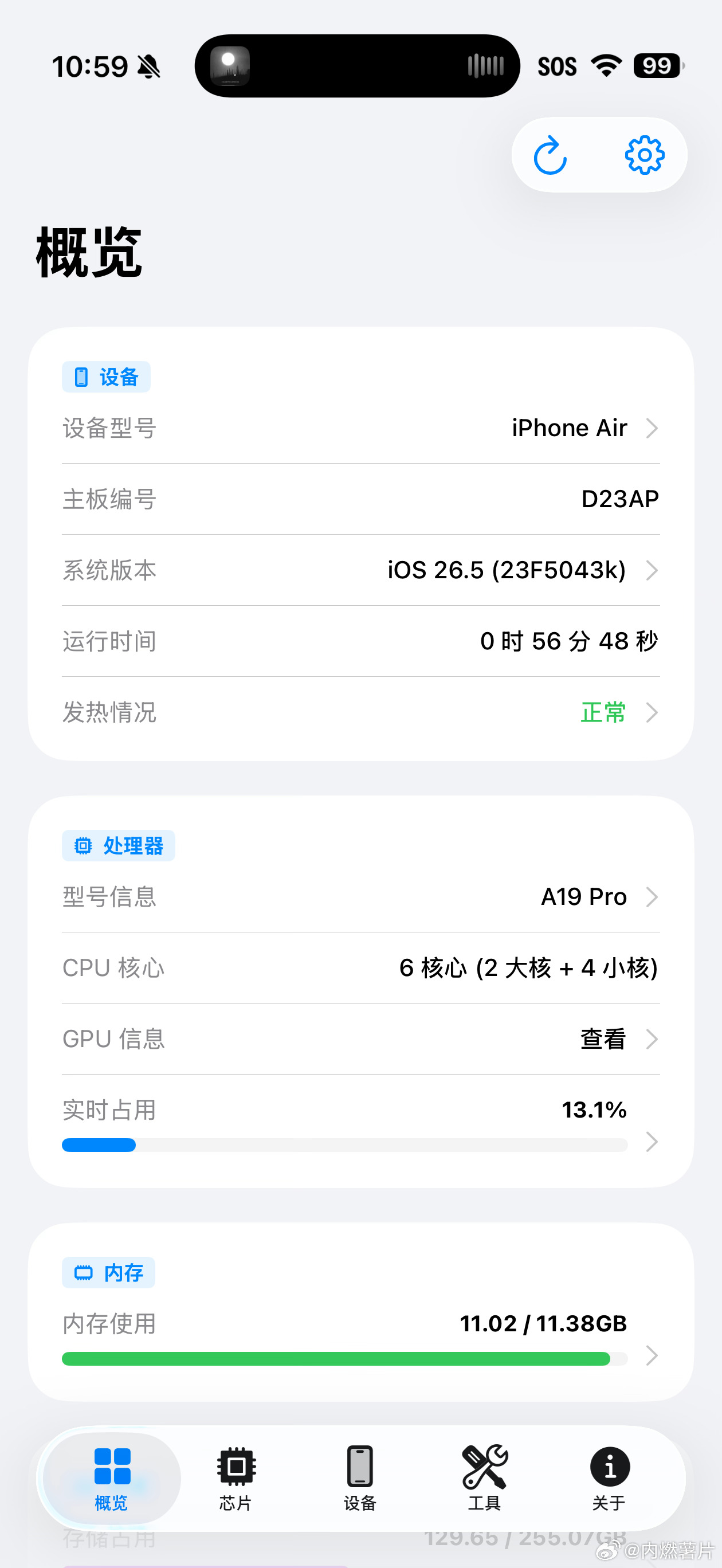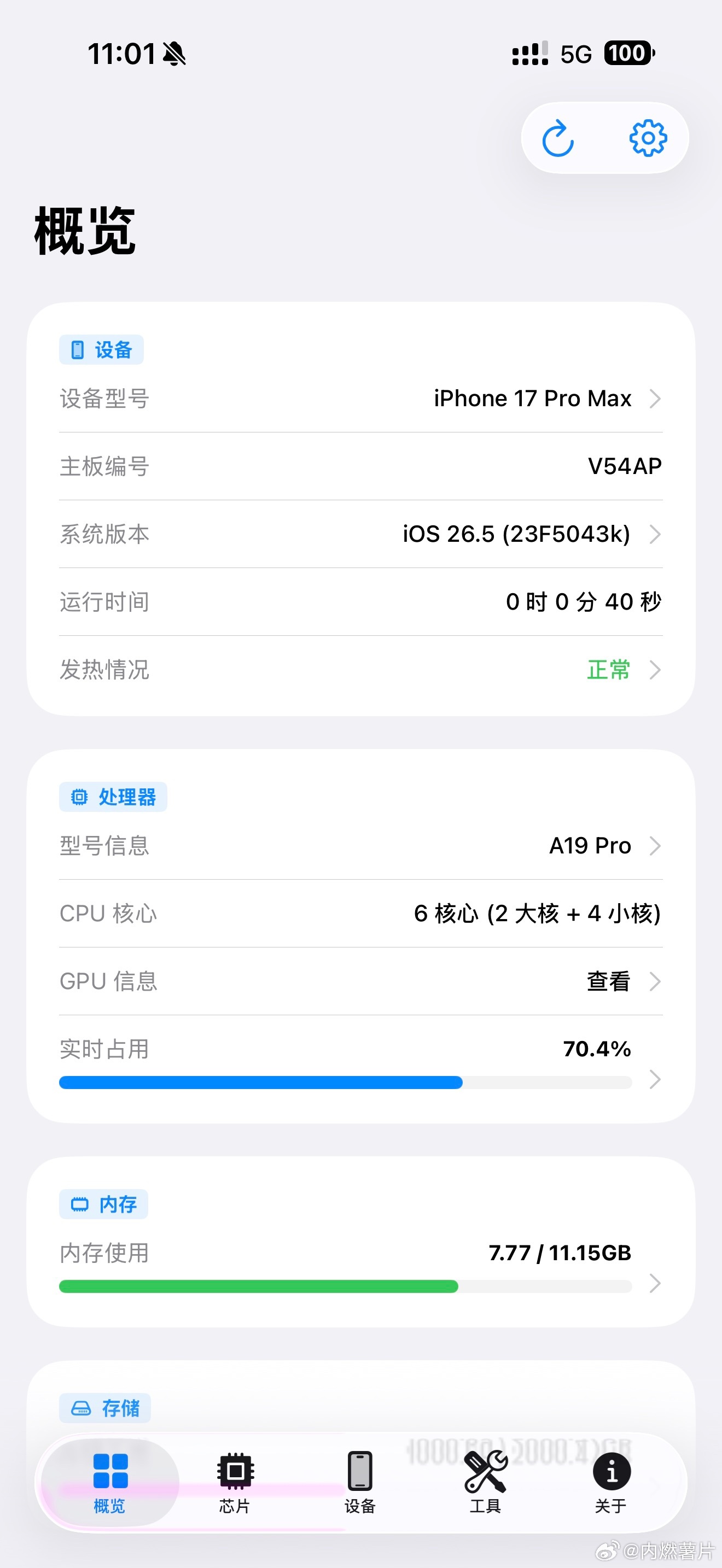不知道是不是 bug 还是苹果机制,17 Pro Max 的内存总量变成 11G,重启以后才正常