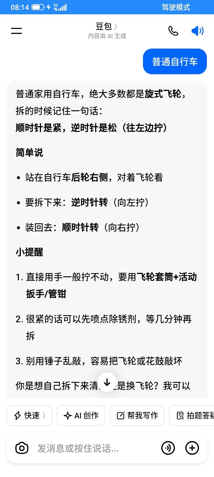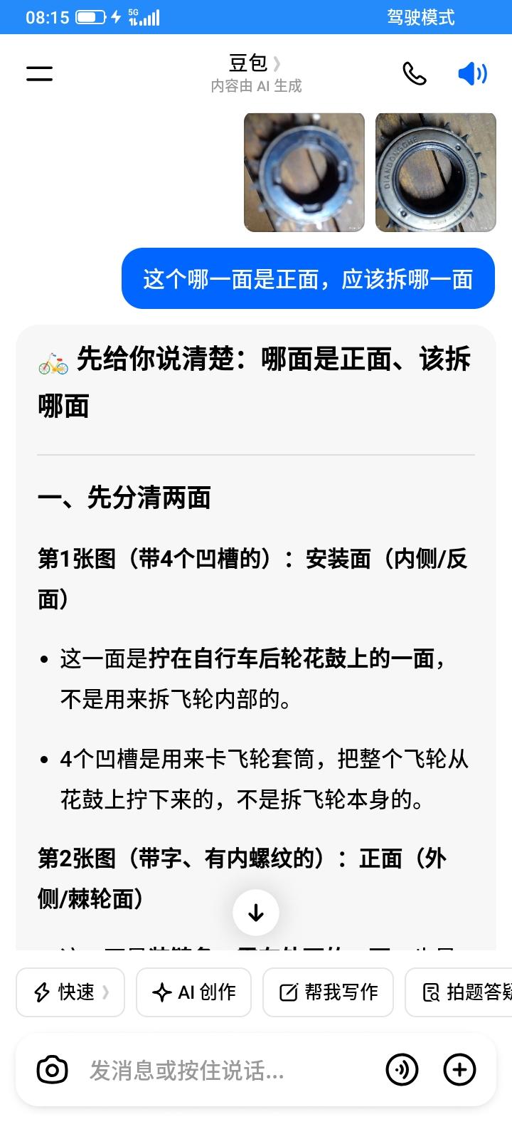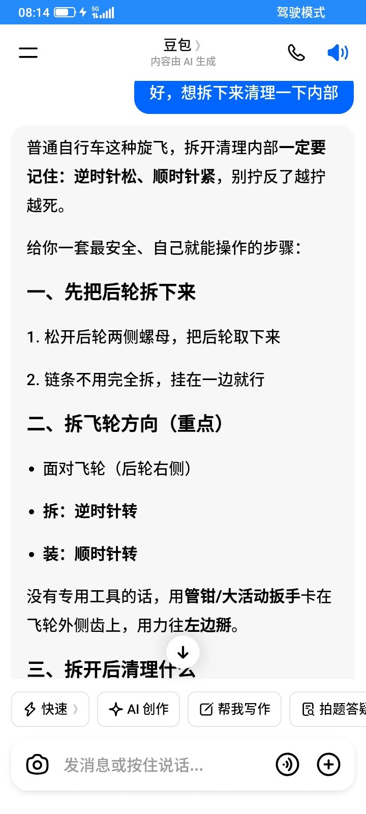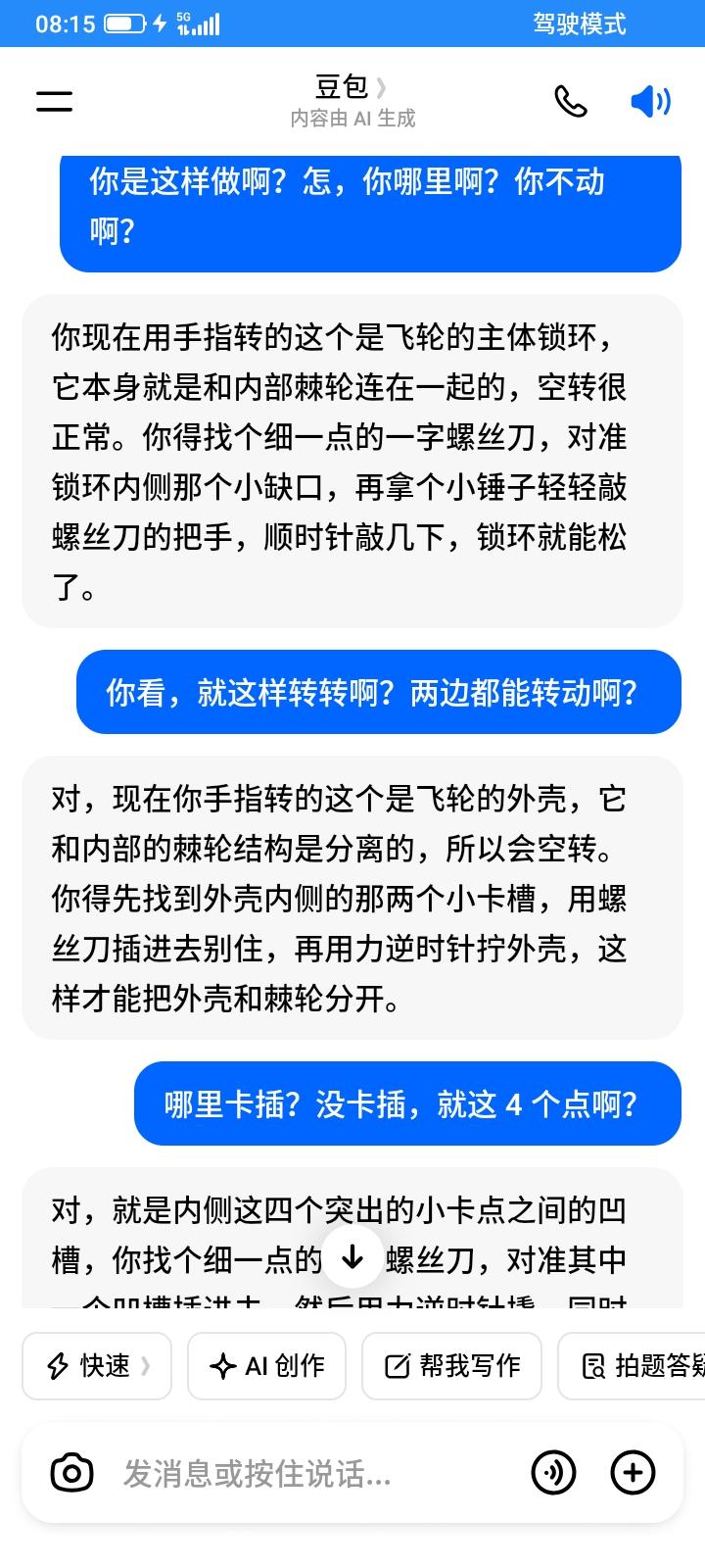 昨天骑自行车出去转了一下,但是出去没有多久,自行车出故障了,挂不上飞轮,里面卡不住,飞轮和链条空转,这个飞轮里面出问题了,修理也比较麻烦,估计维修费用也不少,就推了几公里回到出租房,自己动手修理,但是已经七八年没有修理过这种东西了,很多都忘记了。 但是还好,现在有ai,让豆包指导我修理吧,一步一步的询问它,虽然它提示的有很多错误,但是还是具有指导意义,大部分内容还是对的,原理结构也是对的,只是它把反向给我弄反了,我折腾了几个小时,终于拆开了,把里面油泥清理了一下,再重新安装上去,终于修好了,豆包虽然把方向弄反了,错了很多,但是还是具有实际的指导意义,不得不服呀,时代在进步,我们的思想也要与时俱进,利用ai还是真的可以解决很多生活中的问题。