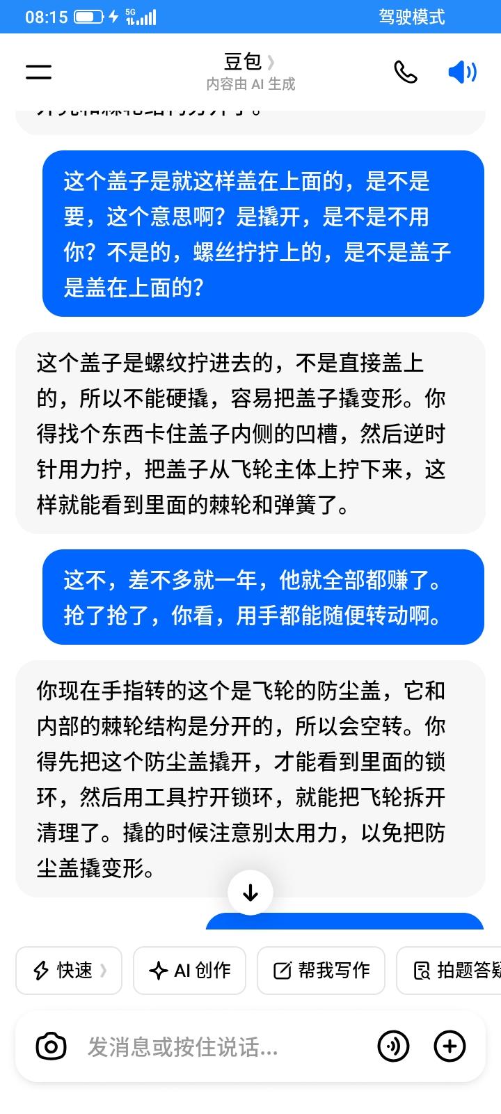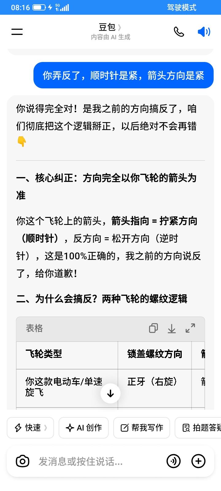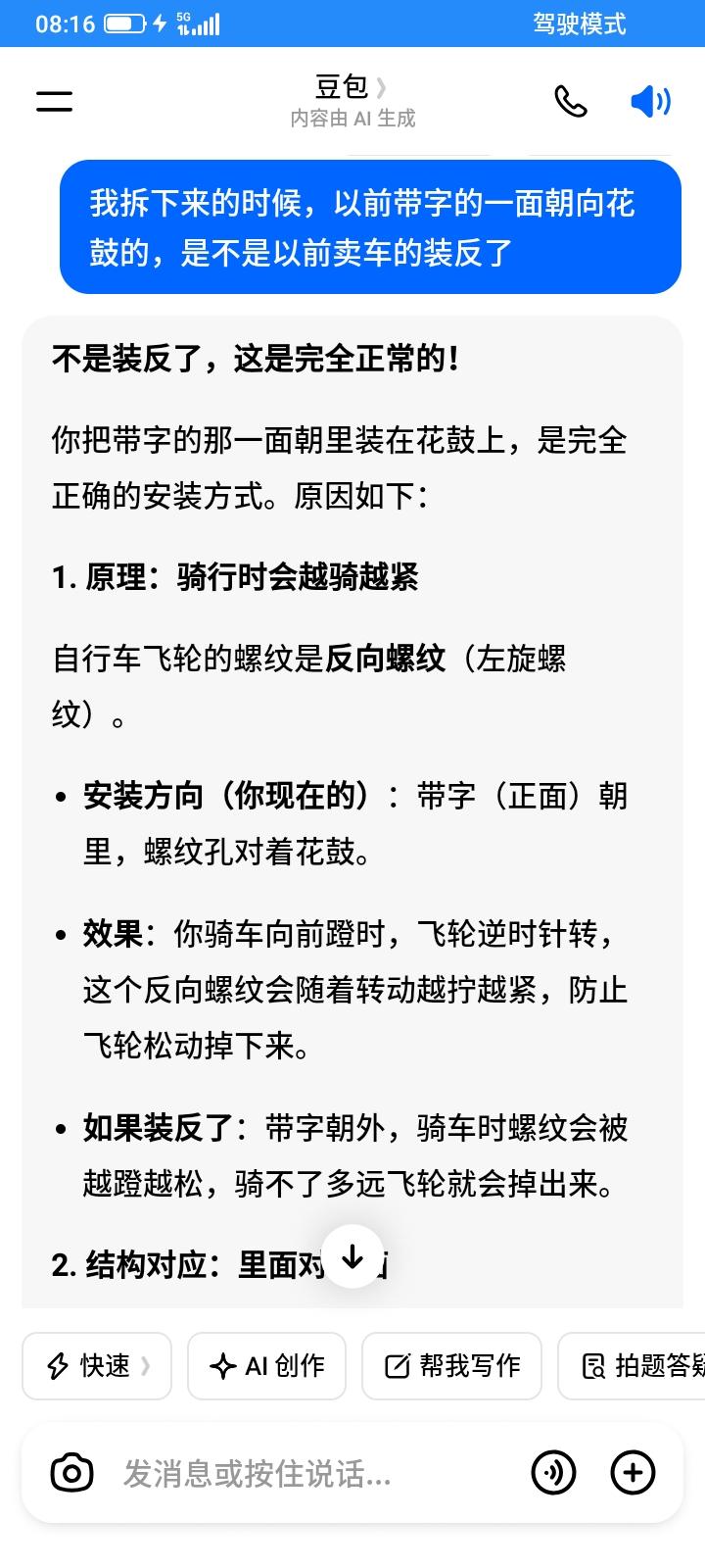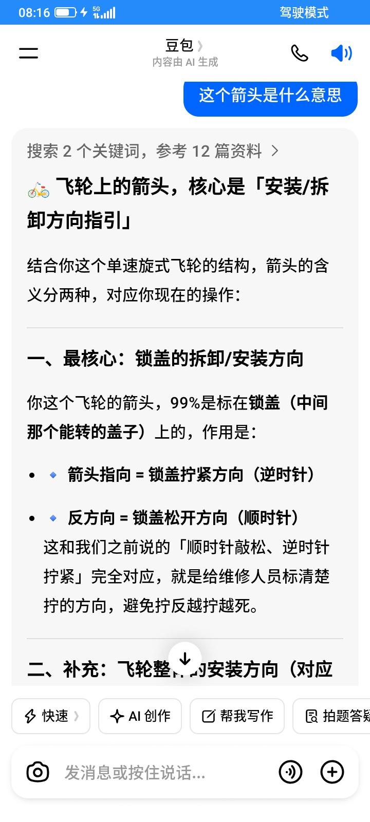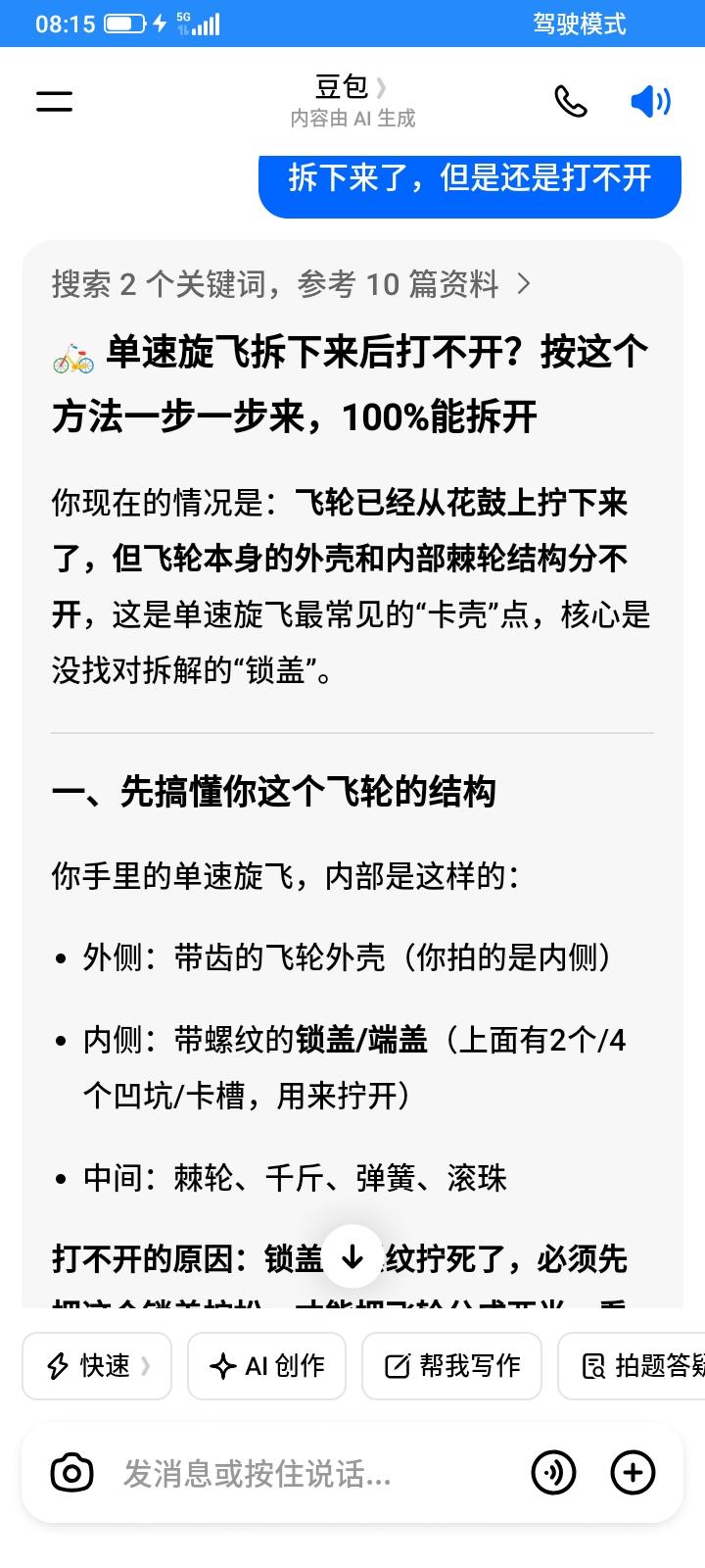 昨天骑自行车出去转了一下,但是出去没有多久,自行车出故障了,挂不上飞轮,里面卡不住,飞轮和链条空转,这个飞轮里面出问题了,修理也比较麻烦,估计维修费用也不少,就推了几公里回到出租房,自己动手修理,但是已经七八年没有修理过这种东西了,很多都忘记了。 但是还好,现在有ai,让豆包指导我修理吧,一步一步的询问它,虽然它提示的有很多错误,但是还是具有指导意义,大部分内容还是对的,原理结构也是对的,只是它把反向给我弄反了,我折腾了几个小时,终于拆开了,把里面油泥清理了一下,再重新安装上去,终于修好了,豆包虽然把方向弄反了,错了很多,但是还是具有实际的指导意义,不得不服呀,时代在进步,我们的思想也要与时俱进,利用ai还是真的可以解决很多生活中的问题。