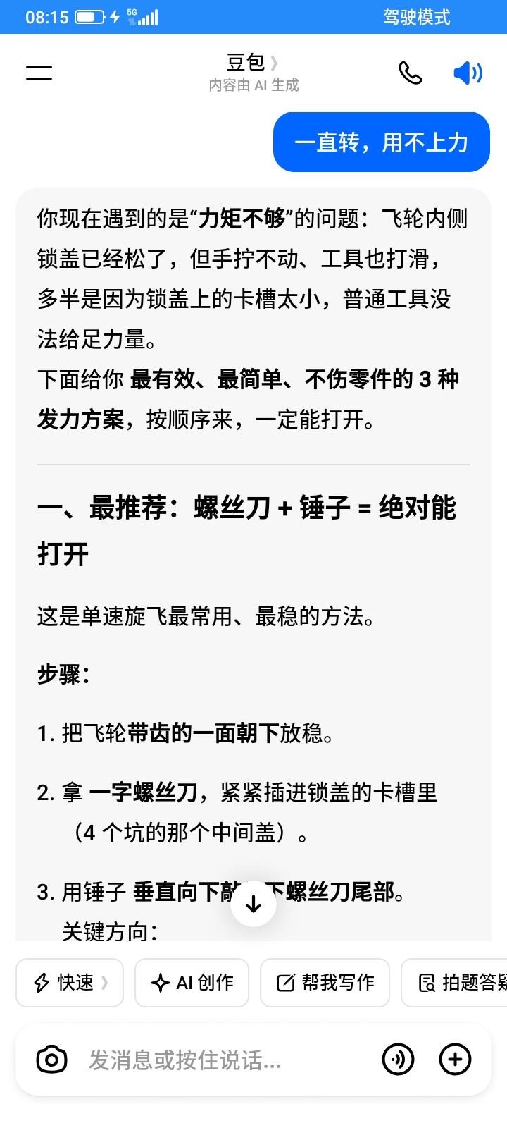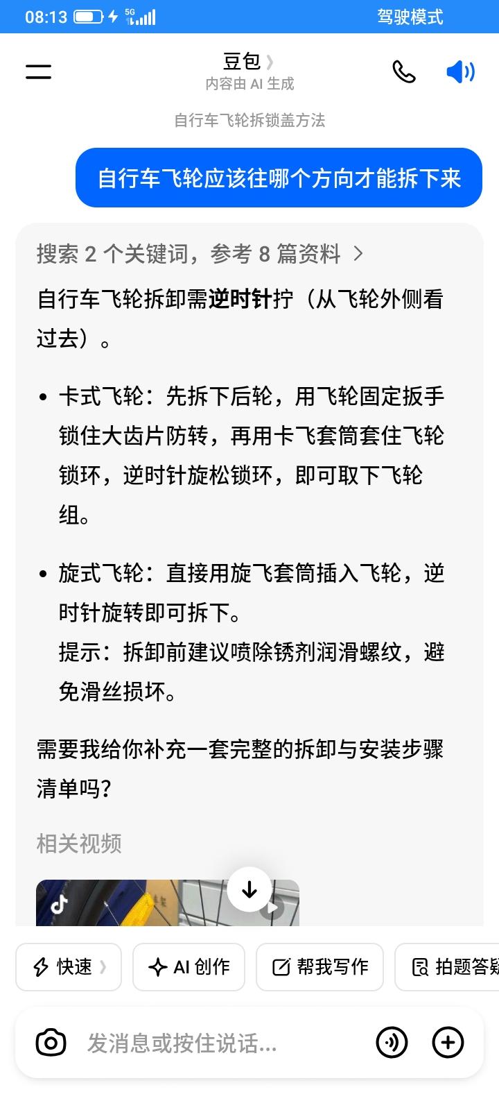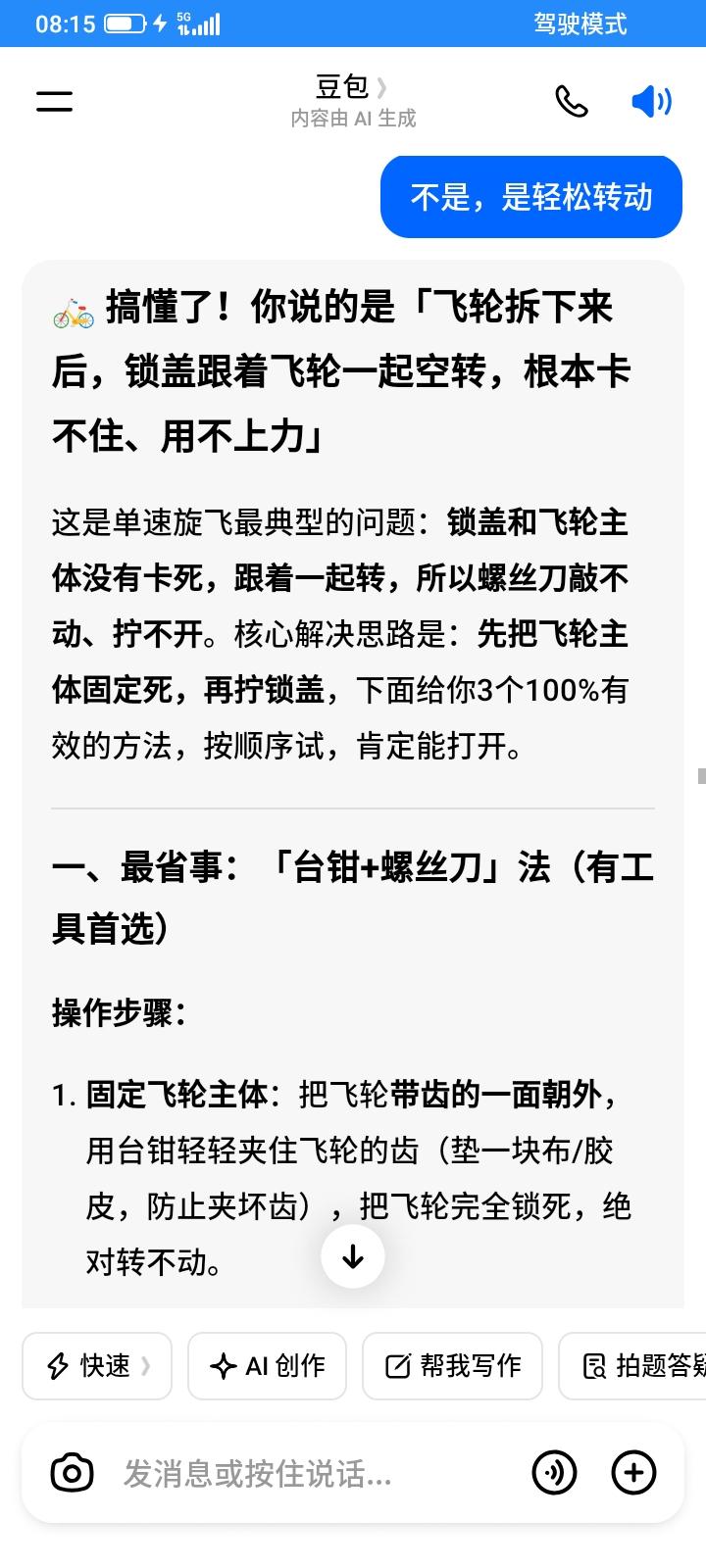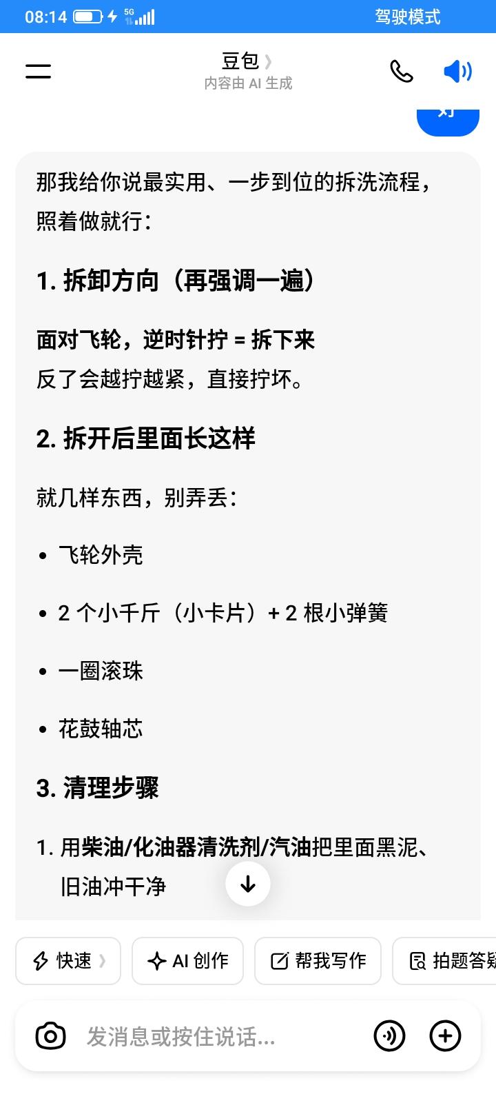 昨天骑自行车出去转了一下,但是出去没有多久,自行车出故障了,挂不上飞轮,里面卡不住,飞轮和链条空转,这个飞轮里面出问题了,修理也比较麻烦,估计维修费用也不少,就推了几公里回到出租房,自己动手修理,但是已经七八年没有修理过这种东西了,很多都忘记了。 但是还好,现在有ai,让豆包指导我修理吧,一步一步的询问它,虽然它提示的有很多错误,但是还是具有指导意义,大部分内容还是对的,原理结构也是对的,只是它把反向给我弄反了,我折腾了几个小时,终于拆开了,把里面油泥清理了一下,再重新安装上去,终于修好了,豆包虽然把方向弄反了,错了很多,但是还是具有实际的指导意义,不得不服呀,时代在进步,我们的思想也要与时俱进,利用ai还是真的可以解决很多生活中的问题。