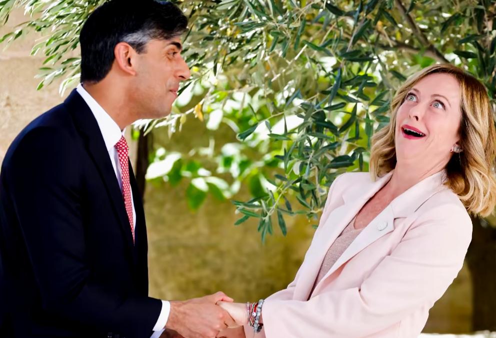 梅洛尼这是被苏纳克和泽连斯基给吓得后仰吗? 梅洛尼和苏纳克一起时,这后仰的动作有