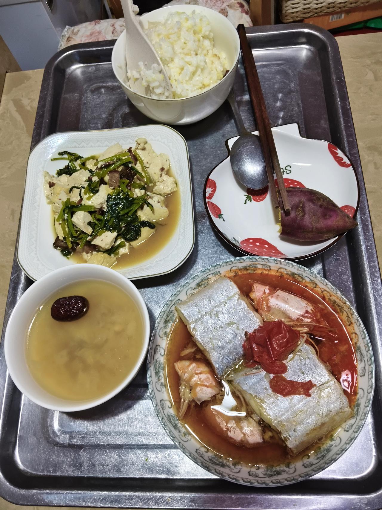 刀鱼我所欲也,只是嫌腥; 茼蒿我所欲也,草味太浓。 流行话说:只要思想不滑坡,办法总比困难多。怎么样用一种既不是传统的高油高盐高糖也不用葱姜蒜掩盖味道,而且能够调节食材的色香味? 我是这样操作的。 清蒸刀鱼常规少放一点盐、油,然后放几瓣西红柿,蒸熟了以后的效果是红白相间、咸香微酸没有了鱼腥味,吃起来不那么刺激舌头,口感平淡口舌生津,这个效果很不错。 茼蒿炖豆腐放少许牛肉干,牛肉干最佳,整个菜肴充满了醇厚不腻的牛肉香,没有了茼蒿的青草味道和豆腥味,这不是新鲜牛肉能够达到的效果。 炖一碗银耳百合大枣羹。 这个晚饭吃起来以后,没有饭后那种昏昏欲睡的感觉,也没有口渴喝水喝的肚子胀的要求,营养丰富全面口感不腻,没有过分的饱腹感,得意自己这个即兴发挥。 欢迎批评。
