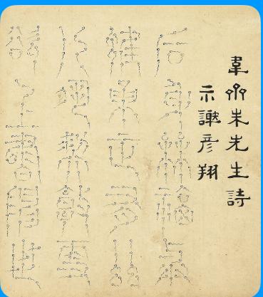 韋齋朱先生詩《芍藥》:紅顏素臉出春殘,裊裊傳傳態自完。香道揚州冠天下,何年跨鶴往吟看。注:雲霞篆,書譜有體不載姓氏,或云李通古玉箸之法也。