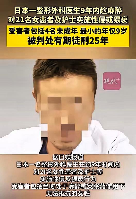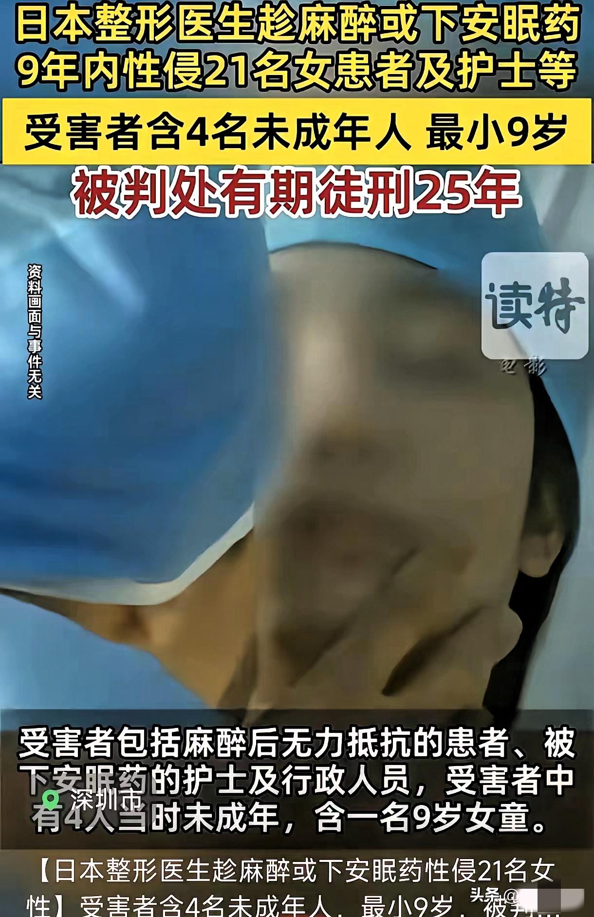 近日,日媒曝出一起惊天丑闻: 东京一家整形外科诊所里,有个46岁男医生,专门趁女患者打了麻醉没意识的时候开始性侵和猥亵。就连诊所里的女护士也不放过,偷偷在水里、饭里下安眠药,等人昏睡了再下手。被他伤害的女性足足有21人,其中竟然还有4个未成年,最小的才9岁。 咱们普通人去看病,不管是做常规治疗还是整形项目,对医生肯定抱着百分百的信任。尤其是打了麻醉之后,人完全失去意识,连基本的反抗能力都没有,等于把自己的安全全交到了医生手里。可这个46岁的男医生,偏偏就利用了这份最基础的信任,把本该救死扶伤的诊所,变成了自己持续作恶的场所。 根据日本警方和当地主流媒体披露的信息,这名医生的作案并非一时冲动,而是有明确预谋、持续了很长时间的惯犯行为。他专门挑没有反抗能力的群体下手:对来就诊的女患者,他借着手术流程正常实施麻醉,等人失去意识后实施侵害;对朝夕相处的女护士,他就偷偷在饮用水、工作餐里投放安眠药,等人昏睡后作案。 目前已经核实的受害者多达21人,其中还包括4名未成年人,年龄最小的孩子只有9岁。这些受害者里,有人只是想做个普通的整形项目改善外貌,有人只是正常到诊所上班谋生,还有的是家长带着孩子前来就诊,最终都遭遇了无妄之灾。很多受害者即便发现了异常,也因为涉及个人隐私、害怕被社会议论,迟迟不敢站出来报警,这也让这名施害者得以长期作案,没有被及时发现。 这件事表面看是单个个体的恶性犯罪,背后却暴露了日本社会长期存在的两个深层问题。一是私人医疗行业的监管存在明显漏洞,日本国内私人整形诊所数量庞大,很多小型诊所的麻醉操作没有规范的监督流程,往往一名医生就能完成全流程操作,全程没有第三方人员在场,给犯罪行为留下了可乘之机。二是日本社会对性犯罪受害者的包容度不足,相关法律对性犯罪的处罚力度长期偏轻,受害者维权成本极高,很多人即便遭受侵害也不愿发声,间接纵容了犯罪行为的发生。 本该守护患者安全的医生,却成了伤害他人的施害者,这种职业信任的崩塌,比恶行本身更让人寒心。 各位读者你们怎么看?欢迎在评论区讨论。