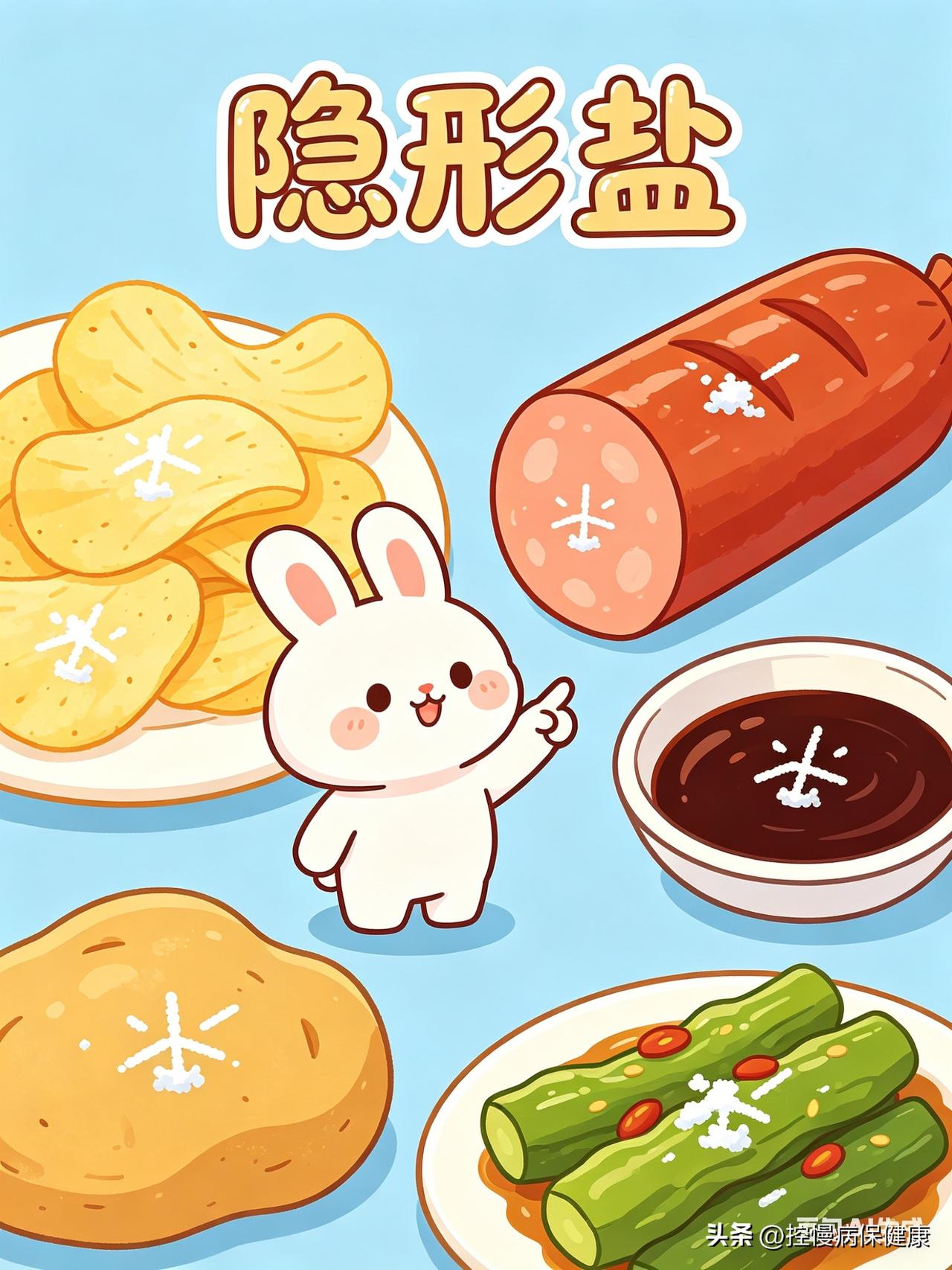 别被“不咸”骗了!这5种食物藏着超多隐形盐 很多人控盐只盯着炒菜的盐勺,却不知日常吃的这些食物,全是“隐形盐”大户! 1️⃣ 调味品刺客 酱油、蚝油、鸡精、豆瓣酱,看着提鲜,实则含盐量惊人!一勺酱油≈1克盐,炒菜少放这些才是关键。 2️⃣ 加工肉类陷阱 火腿肠、腊肉、香肠、午餐肉,为防腐和口感加了大量盐,100克腊肉含盐量能超5克。 3️⃣ 主食也藏盐 白面包、挂面、苏打饼干、花卷,吃着不咸,制作时却加了盐和小苏打,两片面包就含近1克盐。 4️⃣ 零食重灾区 话梅、薯片、坚果、海苔、冰淇淋,甜味能盖过咸味,一包话梅的盐可能就超标。 5️⃣ 腌制食品大户 咸菜、榨菜、腐乳、咸鸭蛋,每100克咸菜含盐2-8克,妥妥的“盐罐子”。 中医讲“咸入肾,过则伤骨”,《黄帝内经》早有“多食咸,则骨痛而发落”的告诫。控盐不仅是少吃盐,更要避开这些隐形盐,护肾又护血管! 盐摄入风险 家用精纯盐 盐危害