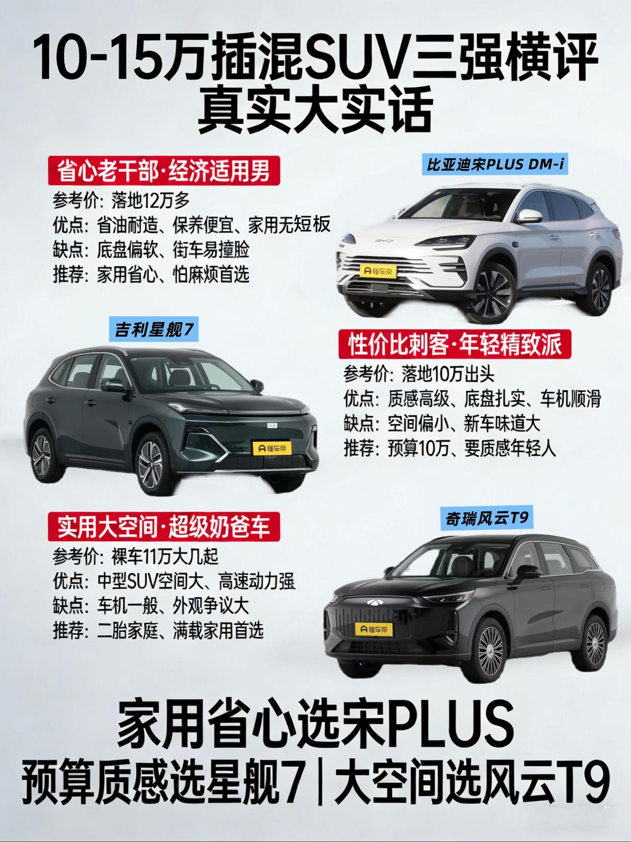 兄弟们,手握10-15万,想买个插混SUV,是不是感觉选择多到裂开?参数表看得脑壳疼,网上水军还多,到底信谁? 别慌,我最近刚好把这仨“卷王”——比亚迪宋PLUS、吉利星舰7、奇瑞风云T9——都摸了一遍,跟销售也磨了嘴皮子。今天咱不念参数,就唠唠大实话,优点槽点不藏着,帮你把钱花在刀刃上。 👉比亚迪宋PLUS DM-i——省心省事的“老干部” 这车现在啥价? 指导价看着是13万多起,但兄弟们,2026年了,这车优惠大啊!现在很多地方落地价也就12万多一点,老将开始“以价换量”了。 它到底好在哪? 省心到“无感”:DM-i这套系统,满街跑的就是证明。亏电油耗也就4个多,充电桩找不到?没事,当油车开,花费也不高。保养、维修,路边摊老师傅都熟,完全不娇气。 坐着挺舒服:座椅软乎,空间够用,一家子出门,后排老人孩子不抱怨。就是那种“说不出哪特别好,但就是没啥硬伤”的感觉。 有啥你得忍忍的? 开起来像“开船”:底盘调得特别软,过个坑洼是舒服,但拐弯快点或者高速变个道,车身晃得你心里有点没底。喜欢开车、讲点操控的兄弟,可能觉得不得劲。 “街车”的烦恼:出门三分钟能碰见五台,追求个性、怕撞脸的,劝你三思。内饰设计也多少有点“审美疲劳”了。 一句话总结:如果你是第一次买车、怕麻烦、纯粹家用代步,就想图个靠谱、省钱、省事,闭着眼睛选宋PLUS,大概率不会后悔。它就是个踏实过日子的“经济适用男”。 👉吉利星舰7——年轻精致的“性价比刺客” 这车现在啥价? 这才是真正的价格屠夫!2026款直接杀到9.58万起,落地十万出头。 它凭啥这么横? 里子面子都给足:坐进去真的不像十万的车!能摸到的地方好多都是软的,设计也新潮,车机屏幕又大又顺滑。关车门那“嘭”一声,厚重感就上来了,心理满足感拉满。 开起来有点“小高级”:底盘是它的绝活,过减速带是“咚咚”两下,很干脆,跑烂路也不散,有种以前开德系车那种“整”的感觉。年轻人开,会觉得这车有点乐趣。 你得接受的现实是? 空间确实小点:为了造型和操控,后排和后备箱空间比宋PLUS小了一圈。如果你是185cm的大高个,或者经常一家五口满载,后排可能会有点憋屈。 新车味儿有点冲:不少车友反馈,这车刚提回来,内饰味道散得比较慢,得多通风晒晒。 一句话总结:如果你预算卡死在10万,但又对生活品质、对车的设计和质感有要求的年轻小两口或者单身贵族,星舰7就是为你量身定做的。它用一半的价格,给了你20万的“体面感”。 👉奇瑞风云T9——能装能跑的“实用派大哥” 这车现在啥价? 官方指导价12.99万起,但现在优惠也不少,很多地方裸车11万大几就能拿下。记住,它可是个中型SUV! 它的核心优势是啥? 空间,空间,还是空间! 后排地台纯平,座椅也宽大,我1米8坐后排能轻松翘起二郎腿。逢年过节拉年货,或者一家人长途自驾,它的优势是碾压级的。 动力是真猛:奇瑞的发动机技术不是吹的,1.5T混动专门机,就算电池没啥电了,后段加速照样有劲,跑高速超车信心十足,不像有些车高速上光吼不走。 你可能不喜欢的地方: 车机有点“直男思维”:功能都有,但用起来没那么“聪明”,菜单逻辑和UI设计,跟吉利、比亚迪比,少了点科技感和灵性。 样子有点“各花入各眼”:前脸那个超大中网,喜欢的人觉得霸气,不喜欢的人觉得有点“用力过猛”。属于设计比较大胆的类型。 一句话总结:如果你是二胎家庭、经常需要带全家老小出门、或者对装载能力有硬性要求的“超级奶爸”或商务小老板,风云T9是这个价位里能给你最大物理空间和最强动力信心的选择。它就是个务实能干的“大家长”。【来自懂车帝车友圈】