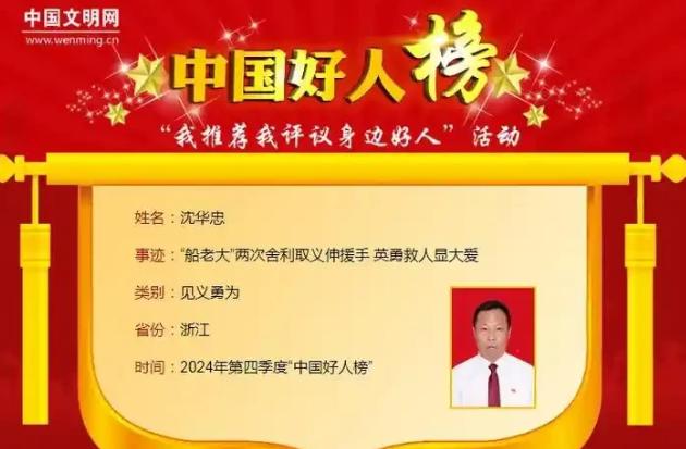 2024年,浙江船老大沈华忠出海时,突然接到求救信号,他当场砍断6300只蟹笼,损失近40万,只为救16名船员,全网刷屏:这才是中国人的良心! 2024年,浙江船老大沈华忠砍蟹笼救人的事迹刷屏全网,一个普通渔民,在近40万财产与16条生命之间,毫不犹豫选择后者,用最朴素的行动,诠释了中国人刻在骨子里的良心。 鲜有人知,这并非他第一次为救人舍弃巨额财产,这份刻在骨子里的善良,早已融入他数十年的耕海生涯。 沈华忠不仅是一名靠海吃饭的渔民,还是岱山县“航行的支部”闯海第二支部书记。 平日里,他在渔区热心助人,创新渔民党员学习方法,牵头调解渔区矛盾,带领合作社渔民致富,合作社年产值可观;闲暇时,他常帮邻里捎带新鲜渔货、为党员基金捐款,在当地口碑极好。 而让他走进公众视野的,是2024年3月12日那场惊心动魄的海上救援。 当天,长江口渔场狂风肆虐、巨浪翻涌,恶劣天气让海上作业充满危险。 沈华忠驾驶“浙岱渔11492”渔船,正在该海域回收6300只蟹笼。 就在众人小心翼翼回收蟹笼时,对讲机突然传来急促的呼救声:附近一艘渔船突发故障失控,16名船员被迫转移至小型救生艇。 其中1人不慎落水,风浪加剧,落水者随时面临失温、溺水危险。 有着数十年航海经验的沈华忠瞬间判断,救援刻不容缓,而拖着蟹笼无法全速航行,唯一的办法就是砍断绳索、舍弃蟹笼。 没有丝毫犹豫,沈华忠当即下达救人指令。 船员们虽心疼辛苦筹备的蟹笼,却无人反对,众人迅速动手,斩断蟹笼绳索,6300只蟹笼瞬间沉入海底。 随后,沈华忠操控渔船,顶着狂风巨浪疾驰而去,凭借丰富经验,在茫茫浪涛中精准定位遇险船员位置。 抵达现场后,救生艇在风浪中摇摇欲坠,落水船员已浑身僵硬、濒临极限。 短短半个小时,16名船员全部安全获救,沈华忠和船员们虽浑身湿透、疲惫不堪,却难掩欣慰。 被救船员看着空荡荡的渔船,深知沈华忠为救自己舍弃了全部心血,纷纷红着眼眶道谢。 沈华忠却淡然摆手,直言人没事就好,钱没了可以再挣。 之后,他驾驶渔船平稳返航,将被救船员妥善移交相关部门,全程未提及自身损失,也未炫耀善举。 事迹传开后,全网刷屏,议论纷纷。 有人认为他太过“愚蠢”,为陌生人损失近40万不值;更多网友被其善举打动,称赞他是中国人的良心。 当地部门授予他见义勇为三等功并发放奖励,沈华忠却表示,海上互帮互助是本分,换做任何渔民都会这样做,人命远比金钱珍贵。 很少有人知道,早在2021年,沈华忠就曾斩断价值10余万元的蟹笼,救起16名失联船员。 两次救人,他累计救回32条人命,损失近50万元,这笔巨款对普通渔民而言难以估量,他却从未后悔。 其实,像沈华忠这样的平凡好人并不少见。 浙江台州一名普通渔民,曾在出海时救援触礁渔船,不顾自身渔船受损、损失数万元,成功救出4名被困船员,事后未索要任何回报。 他们都是平凡人,却在关键时刻挺身而出,用行动诠释善良与担当。 沈华忠只是千千万万普通渔民中的一员,没有惊天壮举,没有华丽言辞,却在利益与生命的抉择面前,守住了内心的善良。 他的事迹之所以刷屏,正因在这个计较得失的时代,他做了很多人想做却不敢做的事。 那些比金钱更珍贵的生命与善良,那些刻在中国人骨子里的良心,值得被永远铭记、一直传颂。 如果各位看官老爷们已经选择阅读了此文,麻烦您点一下关注,既方便您进行讨论和分享,又能带来不一样的参与感,感谢各位看官老爷们的支持!