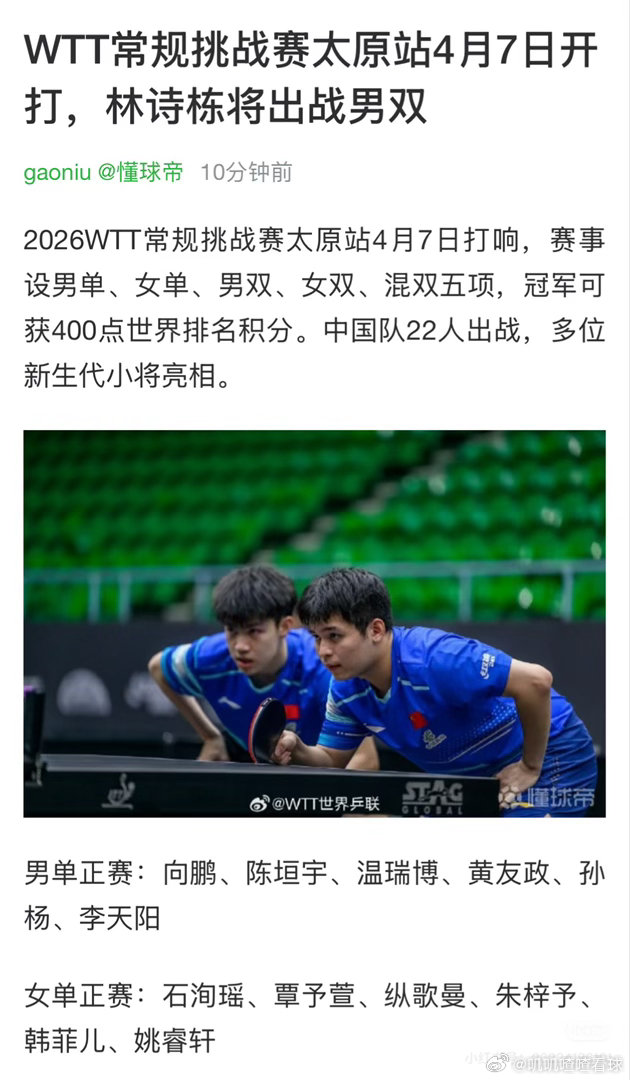 WTT太原常规挑战赛今日开赛该赛事2026年4月7日-4月12日在中国山西太原举行,赛事冠军积分400分,设男女单打、双打和混双5个项目,中国队加油