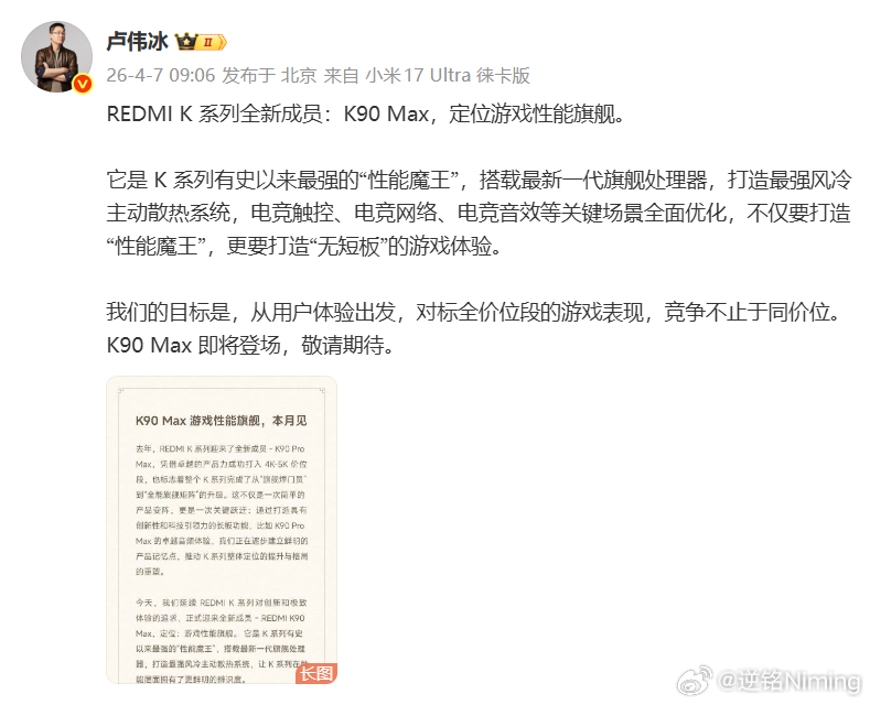 刚刚,REDMI官宣了K90系列的全新成员,K90 Max,这款新机定位是游戏性能旗舰,卢总说它要做K系列的“性能魔王”。