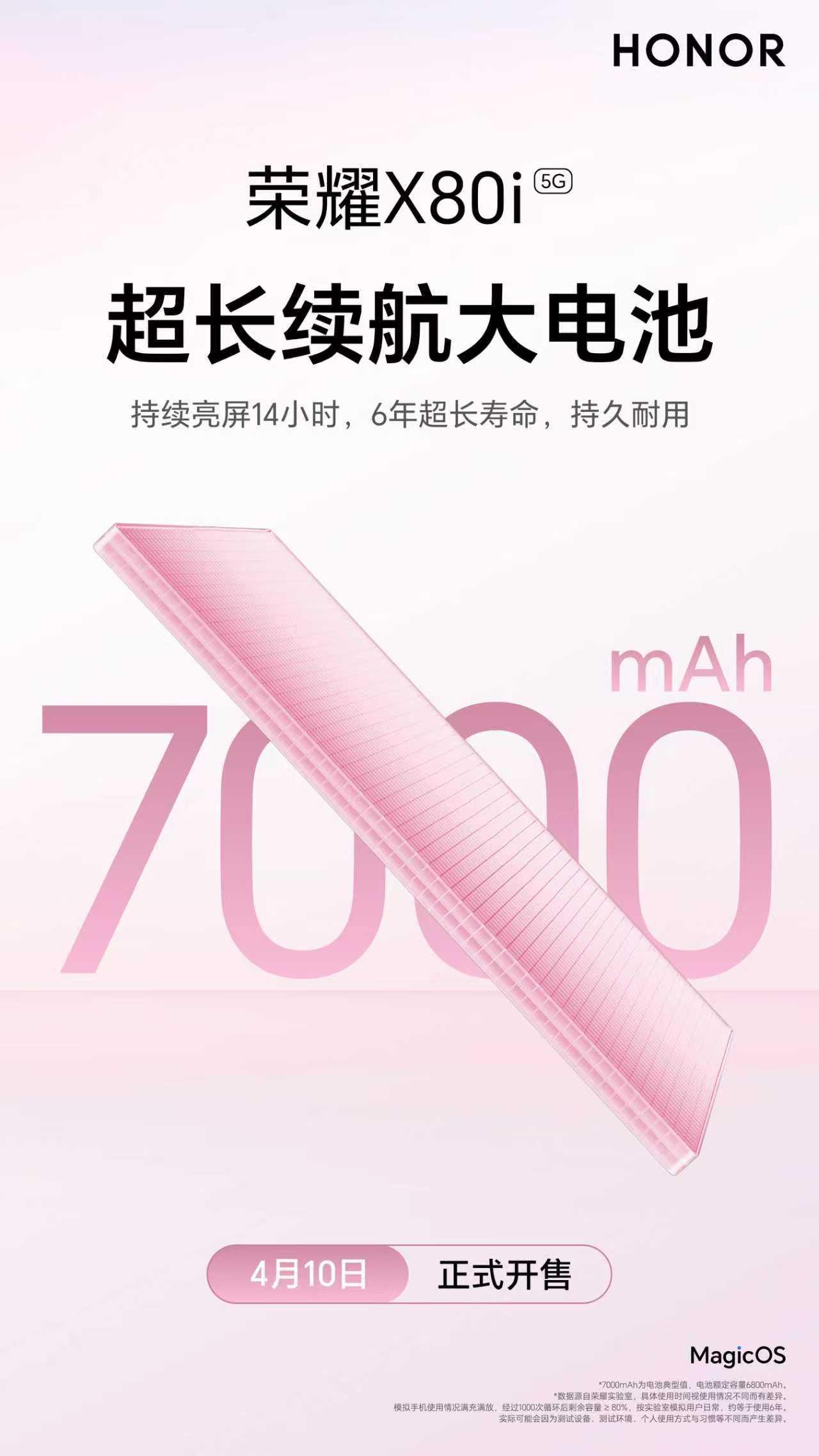 荣耀把更多旗舰机有的品质下放到千元机上,超韧精研金属中框,好看更坚固;1.5K超窄边荣耀绿洲护眼屏,大屏更舒适;7000mAh超长续航大电池,持久更耐用。 4月10日正式开售,敬请期待!数码 春日生活打卡季