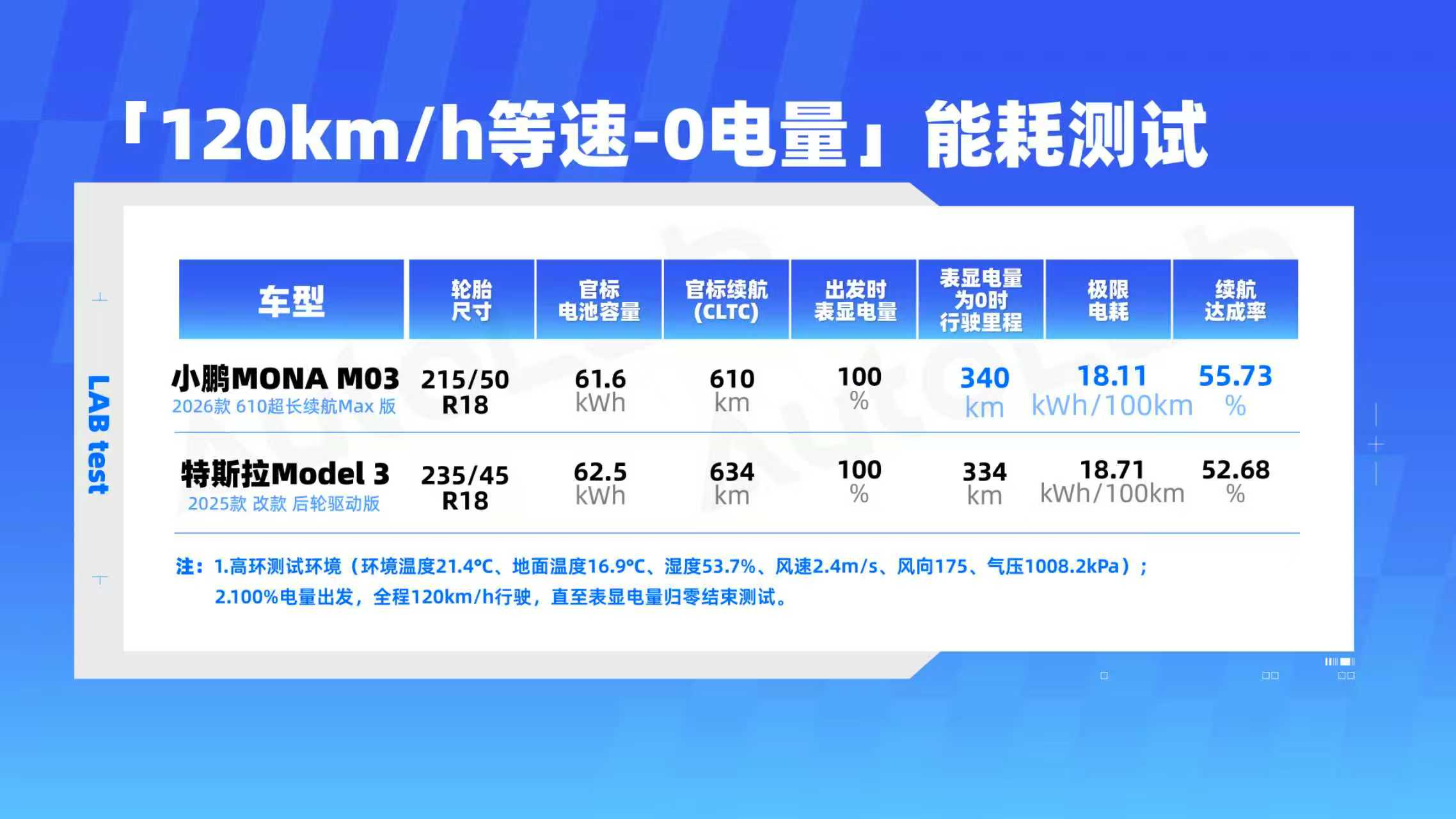 很多人好奇,何小鹏说小鹏MONA M03的能耗是行业最好水平之一,到底是不是营销话术?看实测数据就懂了。在120km/h等速极限测试里,两款车的表现一目了然:- 小鹏MONA M03:满电跑到表显0%,跑了340km,极限电耗18.11kWh/100km,续航达成率55.73%