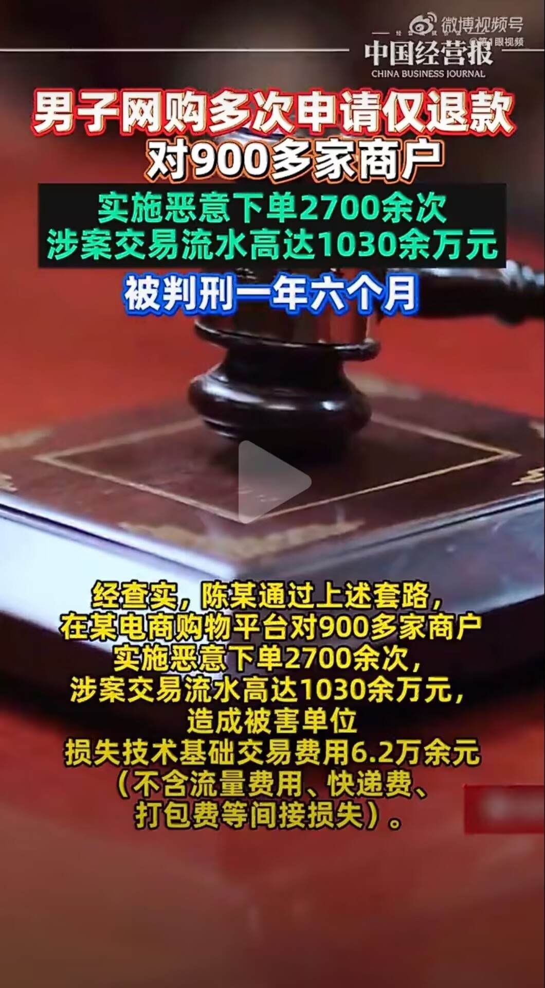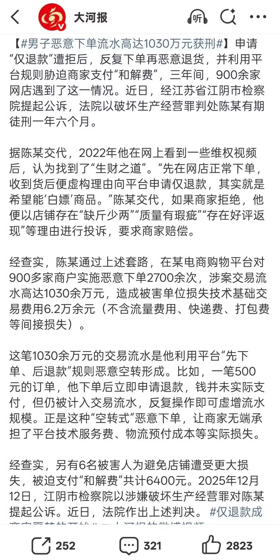 男子恶意下单流水高达1030万元获刑靠恶意下单、碰瓷退款薅商家羊毛,最终把自己薅进监狱,平台也该加强风控了,别总让商家替规则漏洞买单!