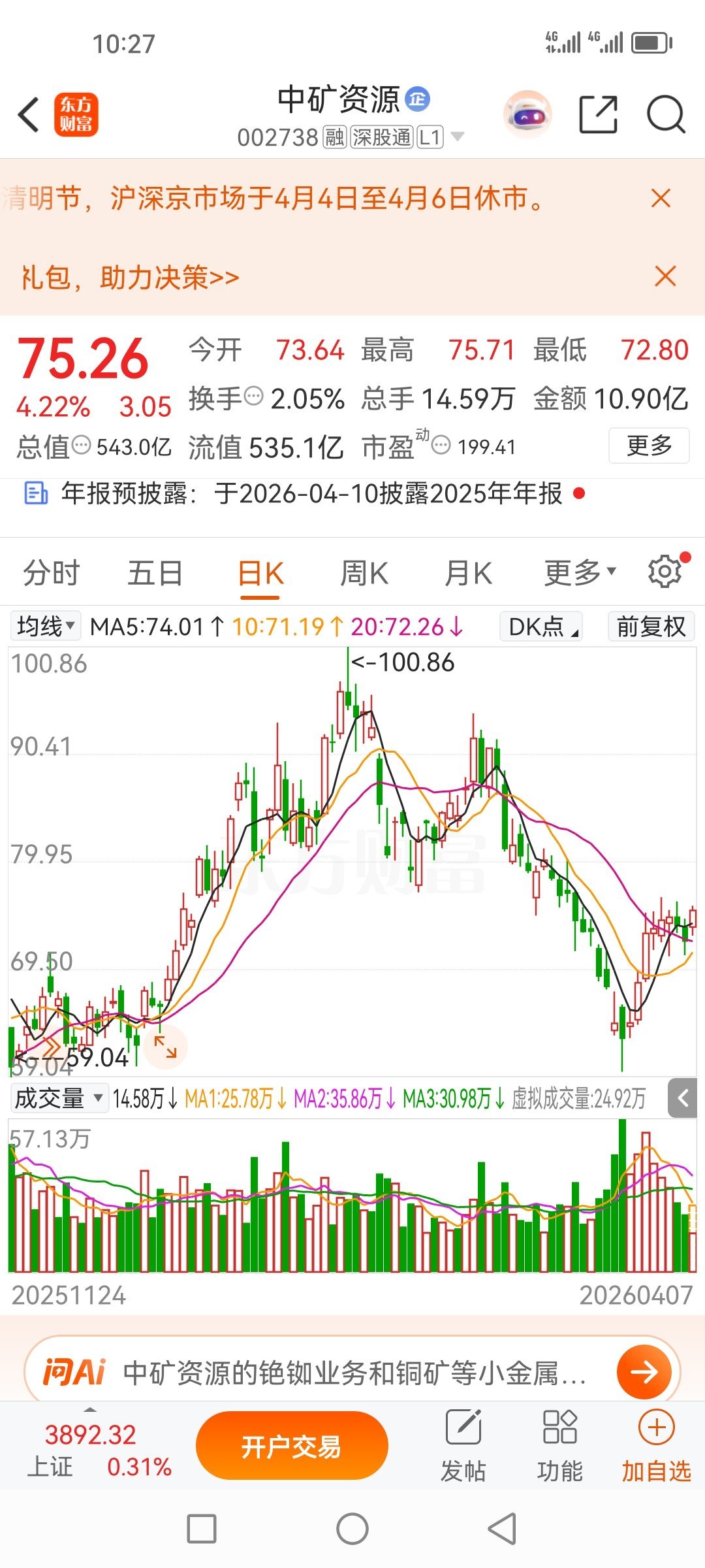27日盘前分享的中矿资源002738今天依旧在涨,最高点75.71,这票这个月底