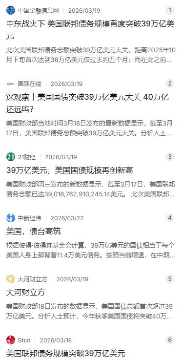 美国现在遇上了一个超级大麻烦,自己根本解决不了,必须要中国出手解决。 麻烦看官老爷们右上角点击一下“关注”,既方便您进行讨论和分享,又能给您带来不一样的参与感,感谢您的支持! 2026年3月,美国财政部发布的数据震惊了全球金融市场。截至3月17日,美国联邦债务总额已经突破了39万亿美元大关,达到了约3.9万亿美元的具体数值。这一数字听起来像天文数字,但把它拆开来看更触目惊心——这意味着平均每个美国人身上背着11.4万美元的国债。更让美国人焦虑的是,从38万亿涨到39万亿只用了大约五个月,而从37万亿涨到38万亿也才用了两个月左右。按照这个速度滚动下去,在今年秋季的中期选举之前,美国国债就将触及40万亿美元。 债务的增长速度让人瞠目结舌。到底是什么在背后疯狂推高这个数字?首先是打仗烧钱。美国近期对伊朗的军事打击行动,开战才几周时间,白宫经济顾问估计已经耗资超过120亿美元,美国国防部还打算向国会申请超过2000亿美元的预算用于后续战争。除了战争开支,疫情期间的天量财政刺激、持续的减税政策,都是债务膨胀的主要推手。 但真正让美国财政扛不住的,还不是债务总额本身,而是还利息的钱已经变成了一个无底洞。根据国会预算办公室的数据,2026财年,美国国债的净利息支出将超过1万亿美元。这个数字有多夸张?它比美国一年的国防预算还要高出几千亿美元,已经成为联邦财政中增长速度最快的支出项目。仅在2026财年的前五个月,美国财政部就已经支付了4330亿美元的利息。也就是说,美国人每个月光是还利息就要掏出差不多900亿美元。 政府一年收上来的钱,将近三成都要拿去还利息,这本身就说明了问题的严重性。更可怕的是,这种局面还在持续恶化。国会预算办公室预测,到2036年,每年的利息支出将翻倍到超过2万亿美元。利息支出一路飙升,直接结果就是预算赤字也在跟着膨胀。2026财年,联邦预算赤字预计达到1.9万亿美元,占GDP的5.8%。这个比例远远超出了过去五十年平均3.8%的水平。换句话说,美国现在每个财政年度都要额外借将近两万亿美元,才能勉强维持政府运转。 赤字占GDP接近6%意味着什么?意味着美国政府的支出增长速度远远超过了经济增长的速度,入不敷出的缺口越来越大。而这种“借新还旧”的游戏能玩下去,前提是有人愿意继续借钱给美国。可现在,最关键的海外债主们正在悄悄撤退。 长期以来,中国和日本一直是美国国债最大的两个海外持有者,是美国财政的“大金主”。但现在的趋势让美国财政部坐立不安。中国持有的美债规模已经降到了2008年全球金融危机以来的最低水平,跌破7000亿美元。要知道,中国在2013年的高峰期可是持有超过1.3万亿美元的美债,这十几年下来已经减持了将近一半。与此同时,日本这个美国最大的海外债主也在减持,2025年12月的数据显示日本当月减持了172亿美元。 两个最大的债主同时抛售,对美债市场来说是个极其危险的信号。如果连最大的买家都在撤退,那美国政府的借新还旧游戏还怎么玩下去?美国的融资成本只会越来越高,债务雪球只会越滚越大。 当然,美国也有自己的如意算盘。在债务缠身的同时,特朗普政府还在全球范围内挥舞关税大棒,希望通过提高关税来增加财政收入,弥补赤字缺口。国会预算办公室测算,关税确实带来了一笔额外收入,未来十年预计能增收约3万亿美元。但这笔钱放在1.9万亿美元的年赤字面前,只能说是杯水车薪。更关键的是,关税政策反过来推高了美国的通胀,美联储为了压制通胀又不得不维持高利率,而高利率恰恰让美国还利息的成本水涨船高。这就是一个典型的“左右手互搏”。 美国财政部其实还有一招,那就是找美联储帮忙。如果美联储能大幅降息,美国发新债还旧债的成本就会降下来。但降息会引发通胀反弹,通胀一上来,美联储又不得不加息。这就是美国现在面临的“不可能三角”:降息怕通胀,加息怕经济衰退,保持不动又眼睁睁看着利息支出爆炸式增长。 更深层的问题是,这种债台高筑的局面已经彻底透支了美国的政策空间。美国政府问责局明确指出,不断攀升的债务正在实实在在地伤害普通美国人——房贷利率更高了,买车贷款更贵了,企业因为资金成本上升而减少了投资,工人工资增长乏力,商品和服务价格却在上涨。 而且,美国国会预算办公室多次发出警告,美国正走在一条“不可持续的财政道路上”。彼得·彼得森基金会的估算更直白,按当前的举债速度,除了战争和金融危机时期,美国现代史上从来没有过这么疯狂的财政扩张。 对于美国而言,这个麻烦之所以是“超级大麻烦”,根本原因在于它是一个结构性的死结。削减开支,民众不答应;增加税收,企业不答应;放任不管,利息会把整个财政吃干榨净。