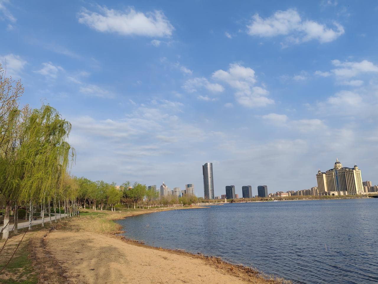 春天的东营悦来湖,垂柳轻抚水面,蓝天白云,湛蓝的湖水,野鸭在悠闲的嬉戏。春天 东营悦来湖东营