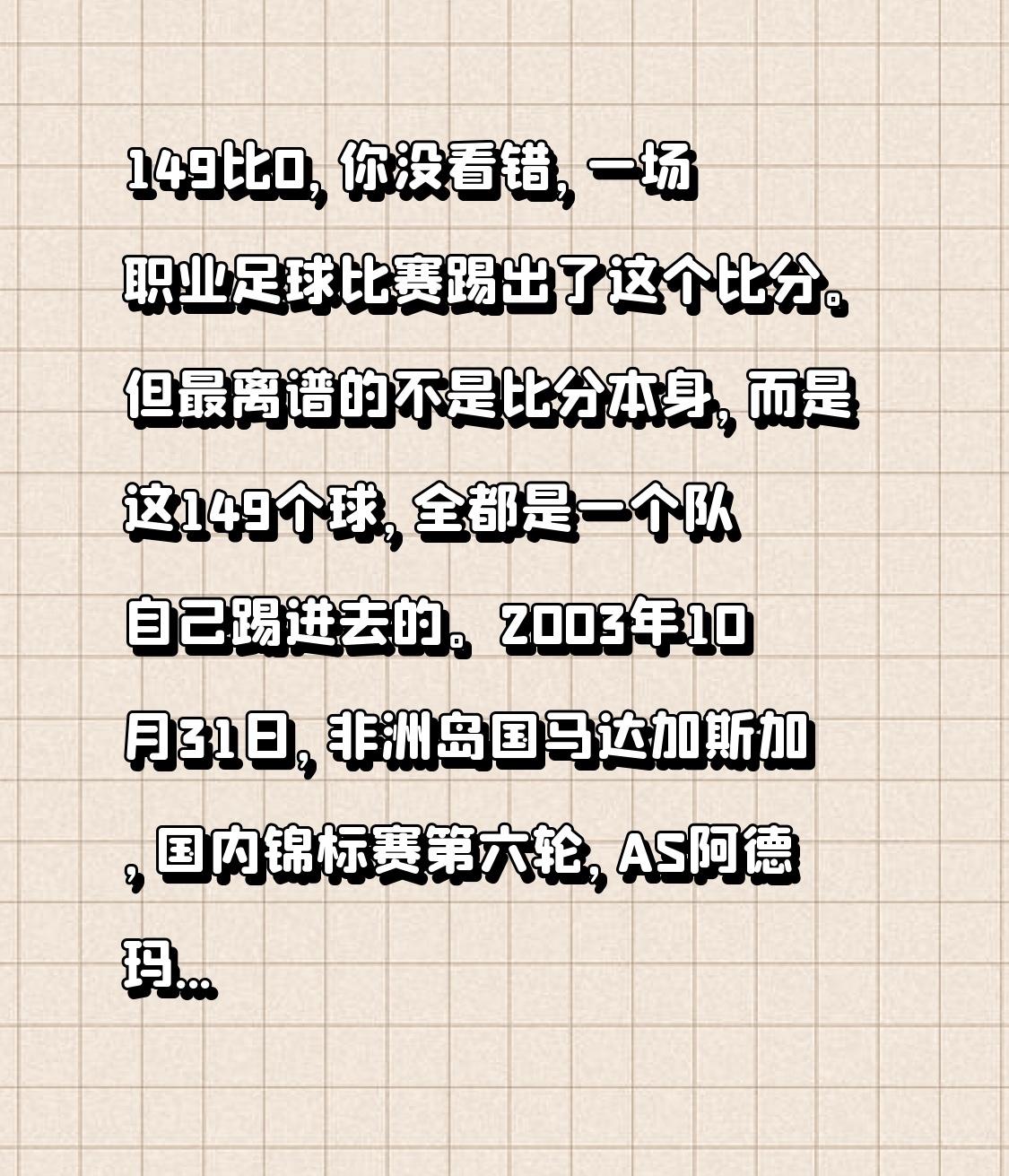149比0,你没看错,一场职业足球比赛踢出了这个比分。但最离谱的不是比分本身,而是这149个球,全都是一个队自己踢进去的。 2003年10月31日,非洲岛国马达加斯加,国内锦标赛第六轮,AS阿德玛对阵奥林匹克埃米内。 开场没多久,埃米内的球员跟裁判发生了激烈争执,原因是之前一轮比赛中裁判的一个判罚让他们觉得自己被黑了。这帮哥们儿越想越气,直接做了一个载入史册的决定——既然裁判不公,那我们就帮对手赢。 于是,从那一刻起,球场上出现了足球史上最荒诞的一幕:埃米内的球员一旦拿球,不是往前场冲,而是转身朝自家球门猛带。门将干脆站在球门线上一动不动,像个看戏的观众。裁判吹哨?继续踢。对方球员懵了,教练疯了,现场观众从震惊变成愤怒,再从愤怒变成绝望。 裁判没有提前终止比赛,因为规则里根本没有写过“如何应对一支主动帮对手进球的球队”。 最终终场哨响,记分牌定格——149比0,全部149个进球都是乌龙球。吉尼斯世界纪录认证,这是足球史上最悬殊的比分。 更荒诞的是,赛后有媒体算了一笔账:149个进球,平均每36秒就有一个乌龙。甚至有人开玩笑说,如果那天有人没看比赛去上厕所,回来一看比分,可能会以为自己穿越了。 事后,埃米内的主教练被永久禁赛,四名球员被长期禁赛。他们本来想用这种方式抗议裁判的不公,结果把自己整个职业生涯搭了进去。 这个故事在非洲足球圈里被传了二十多年,每次提起,老球迷都会摇头说一句:这帮人是真的狠,连自己家大门都踢成筛子了。 那你觉得,这种用自摆乌龙来抗议裁判的方式,到底是硬气还是愚蠢?如果你是场上球员,你会跟着队友一起往自家球门踢吗? 看透足球 足球