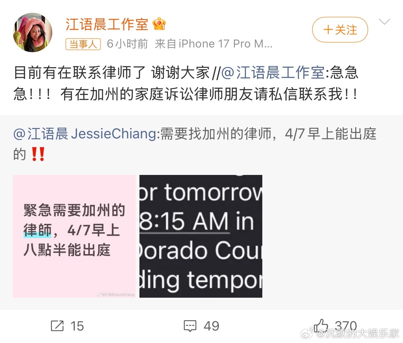 然后江语晨在网上寻4月7日在美国的律师