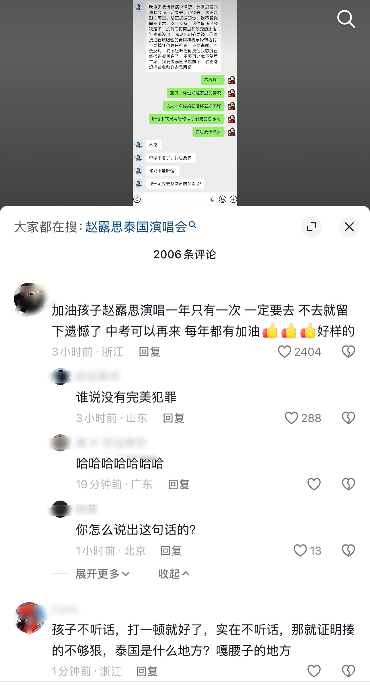 有2000多赞的热评:加油孩子赵露思演唱一年只有一次 一定要去 不去就留下遗憾了 中考可以再来 每年都有加油好样的