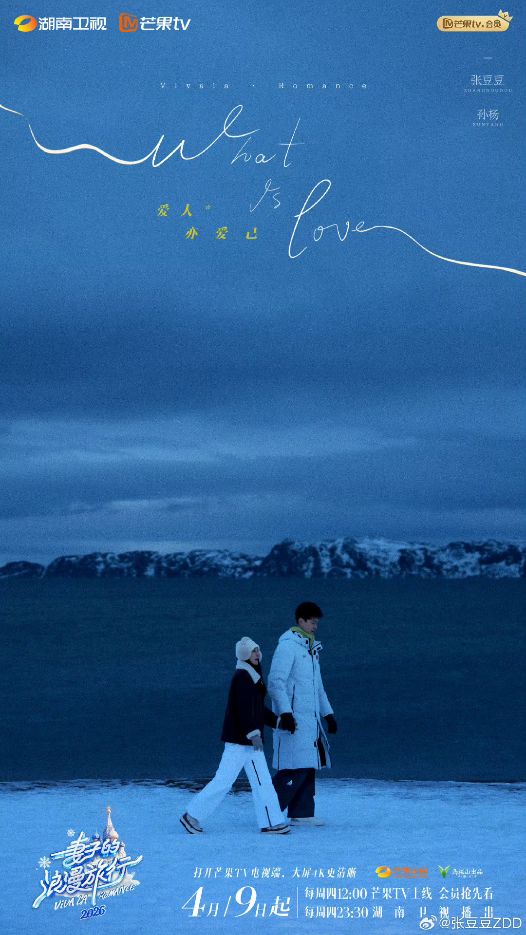 妻子的浪漫旅行2026定档妻子的浪漫旅行嘉2026定档啦!秦昊 & 伊能静,李纯 & 马頔,孙杨 & 张豆豆,金莎 & 孙丞潇,未婚情侣,4月9日起,每周四芒果TV12:00会员抢先看,湖南卫视23:30(1-3期)、22:00(4-12期)播出!期待!妻子的浪漫旅行