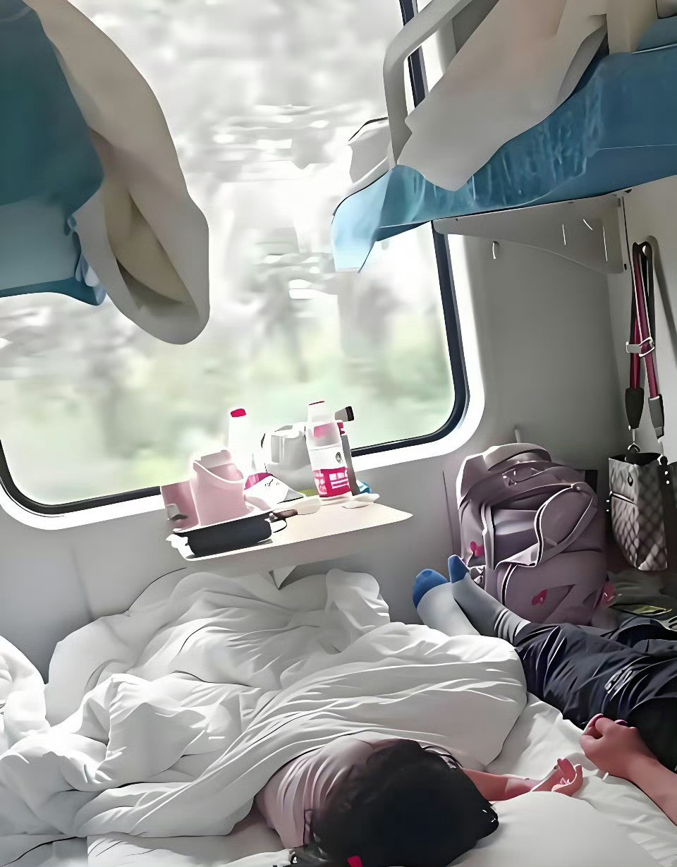 有些人啊,就是气人有笑人无,怎么着你没买到下铺,你还准备踩着人家下铺的桌子下床吗?