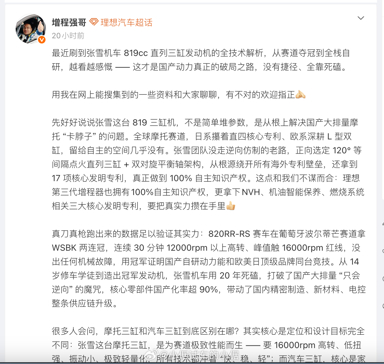 理想汽车高管谈张雪机车倨能聊大V聊车