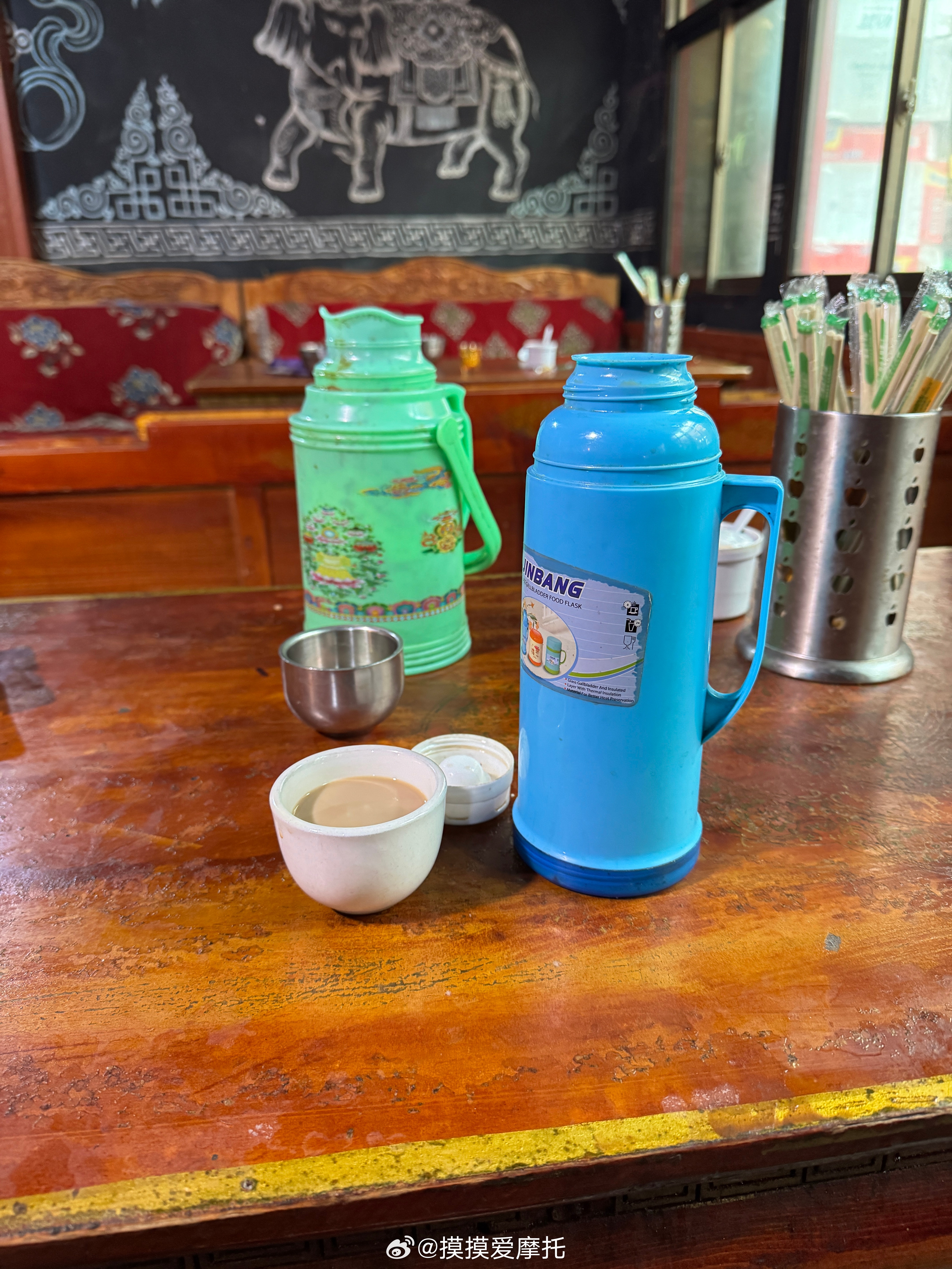 和摸摸去摩旅 很习惯吃当地饭了,挺好吃的!甜茶一小壶3块钱。本田xl750摩旅机车摩托车 昌都·同卡寺
