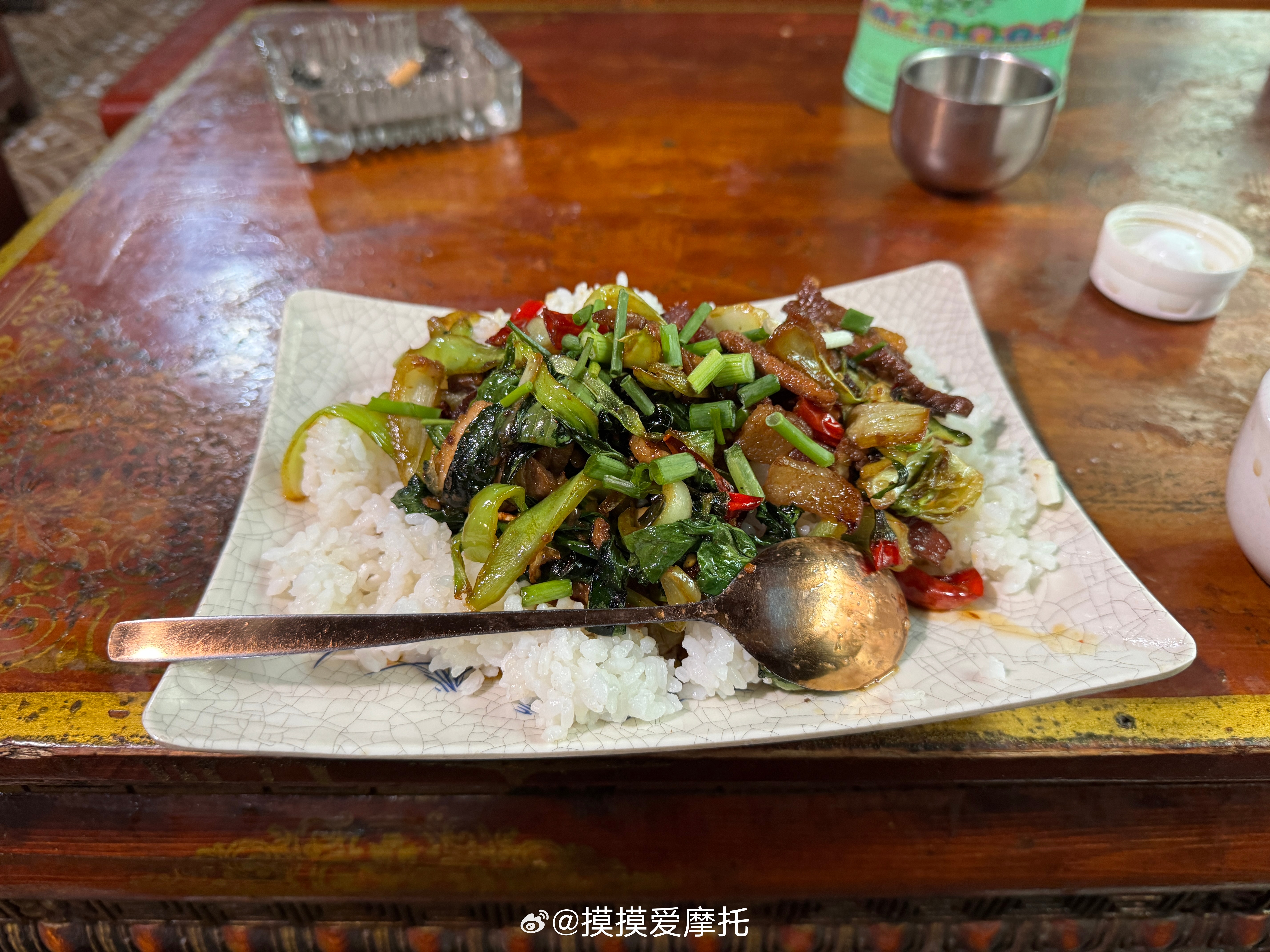 和摸摸去摩旅 很习惯吃当地饭了,挺好吃的!甜茶一小壶3块钱。本田xl750摩旅机