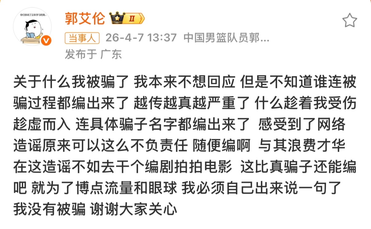 快不要传了,假的!郭艾伦和其工作室相继发表声明,否认被骗。郭艾伦表示,连名字