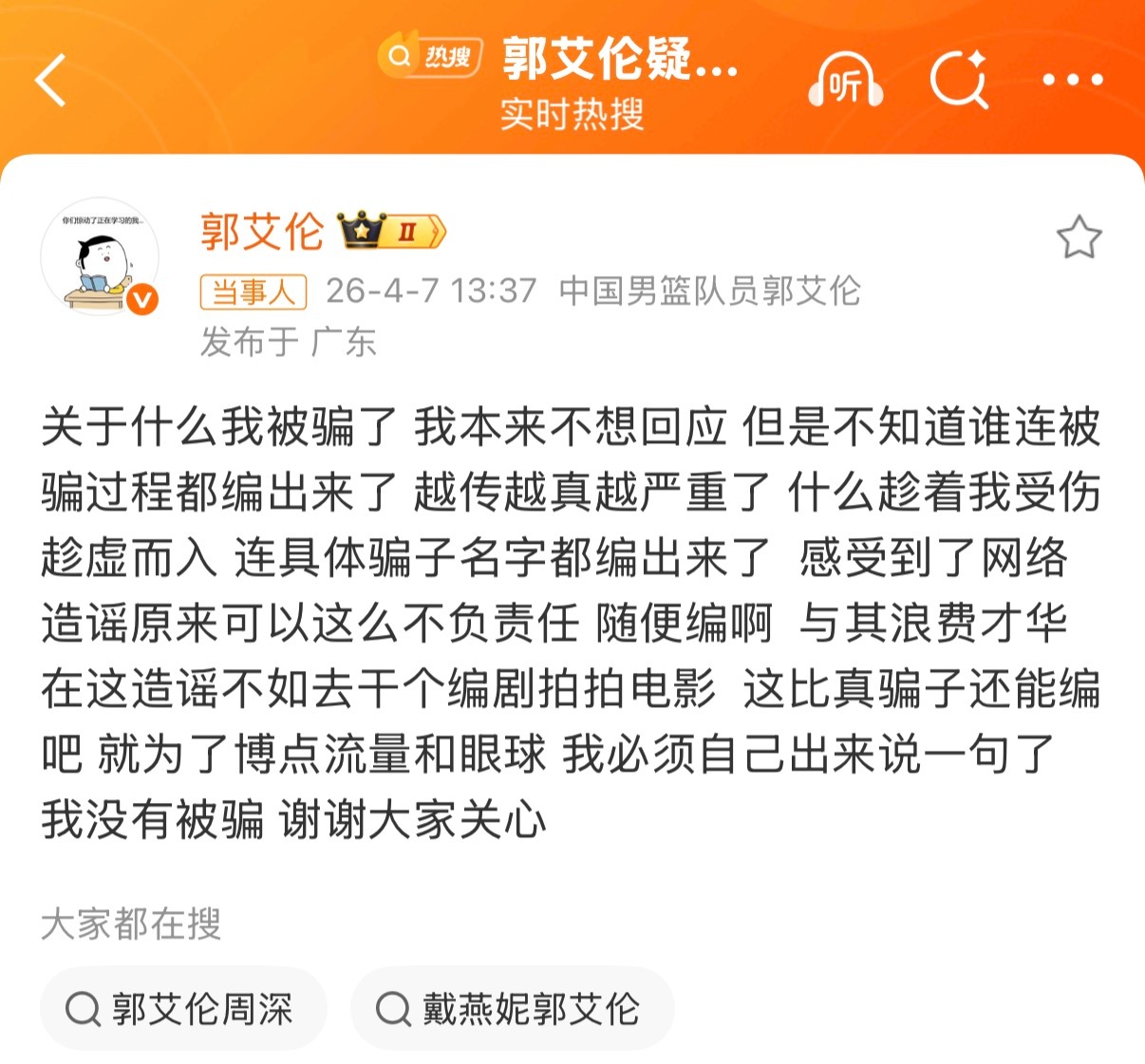 郭艾伦亲自澄清:我没有被骗!郭艾伦否认被骗