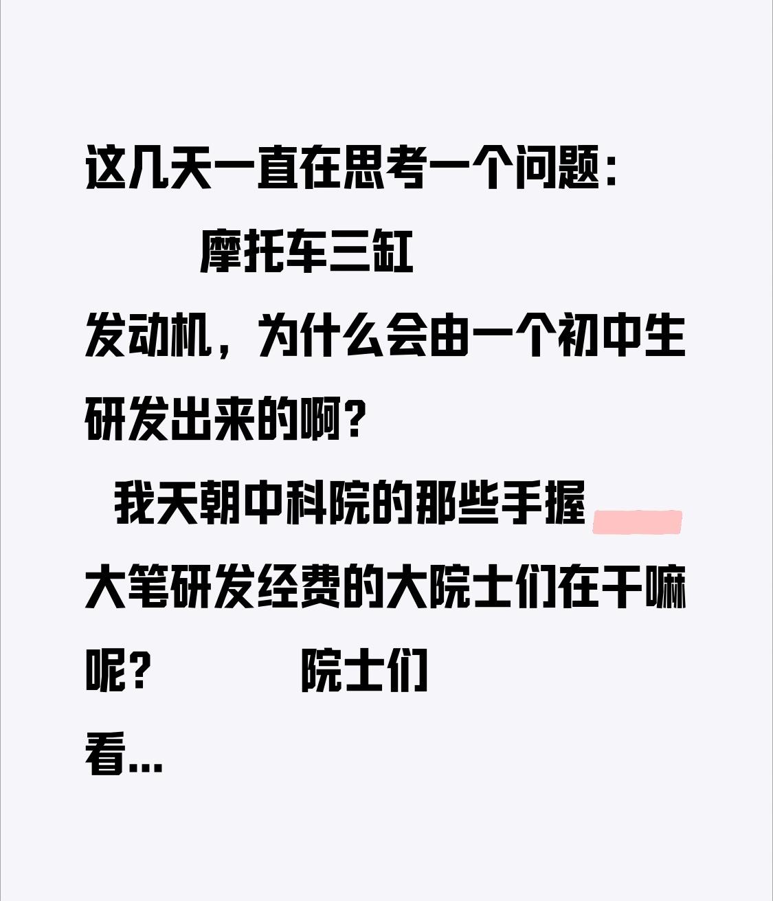 这几天一直在思考一个问题: 摩托车三缸发动机,为什么会由一个初中生研发出来的啊? 我天朝中科院的那些手握大笔研发经费的大院士们在干嘛呢? 院士们看到这个消息心里是怎么想的? 他们有没有什么触动? 他们有没有一些XK?@国家安全部 @人民日报 @中央纪委国家监委网站