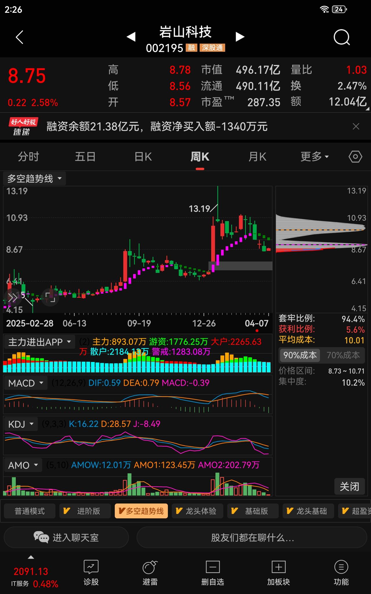 【收益守护】8.76元把岩山科技(002195)留有的底仓于下午清仓,守住收益比博反弹好像更靠谱 提示:理财有风险,投资需谨慎 一、盘面复盘:岩山科技今日走势拆解 今日岩山科技(002195)股价围绕8.75元震荡运行,盘中最高触及8.78元,最低下探8.56元。从盘口数据来看,量能表现相对温和,当日成交额约12.06亿元,换手率2.47%,量比1.03,资金交投情绪不算亢奋。 日线级别上,股价处于近期调整区间,下方8.51元形成短期支撑,筹码分布显示8.79-10.71元为核心成交区间,套牢比例95.4%,获利比例仅4.6%,说明多数筹码处于被套状态,短期抛压仍存。周线维度看,股价自前期高点13.19元回落,MACD指标绿柱延续,KDJ指标处于低位钝化,中期趋势仍未摆脱调整格局。 二、操作逻辑:8.76元清空底仓的核心考量 今日在8.76元清空岩山科技底仓,并非看空后市,而是基于震荡市的交易逻辑做出的止盈选择,核心原因有三点: 其一,股价当前处于8.5-8.8元的区间震荡,缺乏放量突破的明确信号,继续持有大概率是“耗时间”,而非等待趋势拉升; 其二,筹码结构上方套牢盘密集,短期资金难以形成合力突破,盲目持股容易陷入“涨一点就犹豫、跌一点就慌张”的情绪内耗; 其三,结合当下市场缩量环境,岩山科技暂无独立行情驱动逻辑,落袋为安能锁定现有收益,规避后续回调的潜在风险。 三、散户交易心法:谨慎做“空”的真正含义 这里强调的“谨慎做‘空’”,不是指看空市场,而是提醒散户:不要轻易在震荡趋势中盲目做空,也不要在没有把握时空仓踏空,更要避免在无明确机会的行情中频繁操作、损耗筹码。 散户做空的门槛和风险远高于做多,不仅要精准判断趋势拐点,还需承担踏空上涨的机会成本。此次清空底仓,本质是“主动止盈”而非“看空做空”——在没有明确上涨信号时,守住到手的利润,比盲目博反弹更靠谱。 四、后续跟踪重点 后续需重点关注两大信号:一是4月28日即将披露的2025年年报,业绩表现将直接影响股价走向;二是量能变化,若后续股价站稳8.8元且伴随成交额持续放大,可再择机低吸布局,反之则保持观望,不盲目进场。 免责声明:本文仅为市场信息梳理与行业分析,不构成任何投资建议。市场有风险,投资须谨慎。 岩山科技 股市分析 @时光记忆WGW