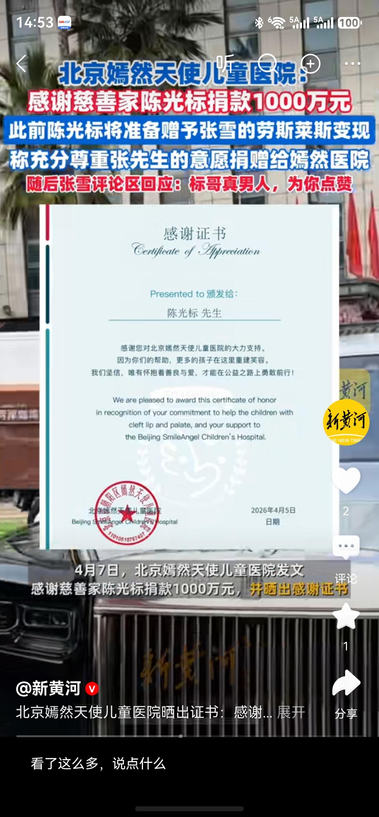 陈光标,李亚鹏,张雪,三个男人大和解,先是李亚鹏晒出陈光标的捐款证书,后是张雪回应:标哥真男人,为你点赞。其实张雪一开始也不是刻意为难标哥,他估计是听说标哥一月份承诺给嫣然的款项没到位,所以逼标哥一把,意思是,你有钱给我捐车,没钱兑现给嫣然的承诺吗?现在标哥没掉链子,张雪点赞也是出于真心。三个人都是真性情,都不差事,都值得点赞。