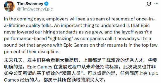 没多久,Epic CEO Tim Sweeney就站了出来,表示将帮助他处理保险问题。但 Tim Sweeney 发表了一段,很多人看完应该会直接沉默的言论。大意是:接下来其他公司会看到一批“职业生涯里都难得一见”的高质量简历。不是裁员,是在向社会输送人才对吧。。。