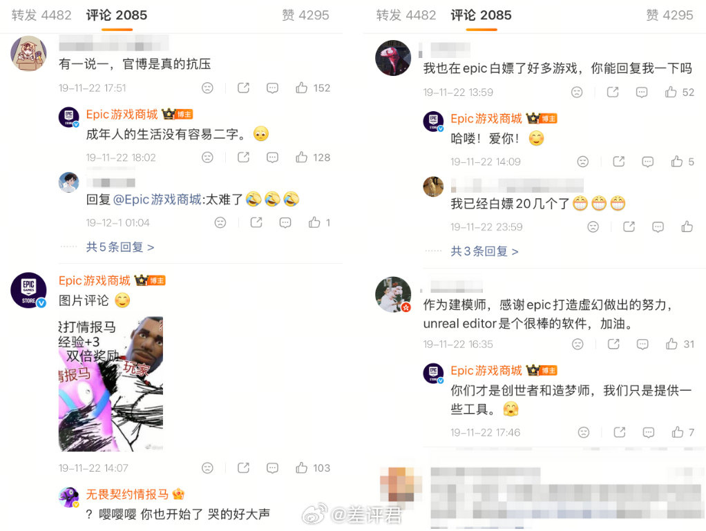 国内大家熟悉的E宝,也在裁员名单中,未来官号都将交还公司。Epic在国内社媒账号是在2009年开始运营的,特有活人感,进退得当。你吐槽,他陪笑,你生气,他自嘲,等你气消了,他还提醒你领Epic的免费游戏,让你别错过羊毛。可以说E宝替Epic在国内玩家心里积攒了很多人气。