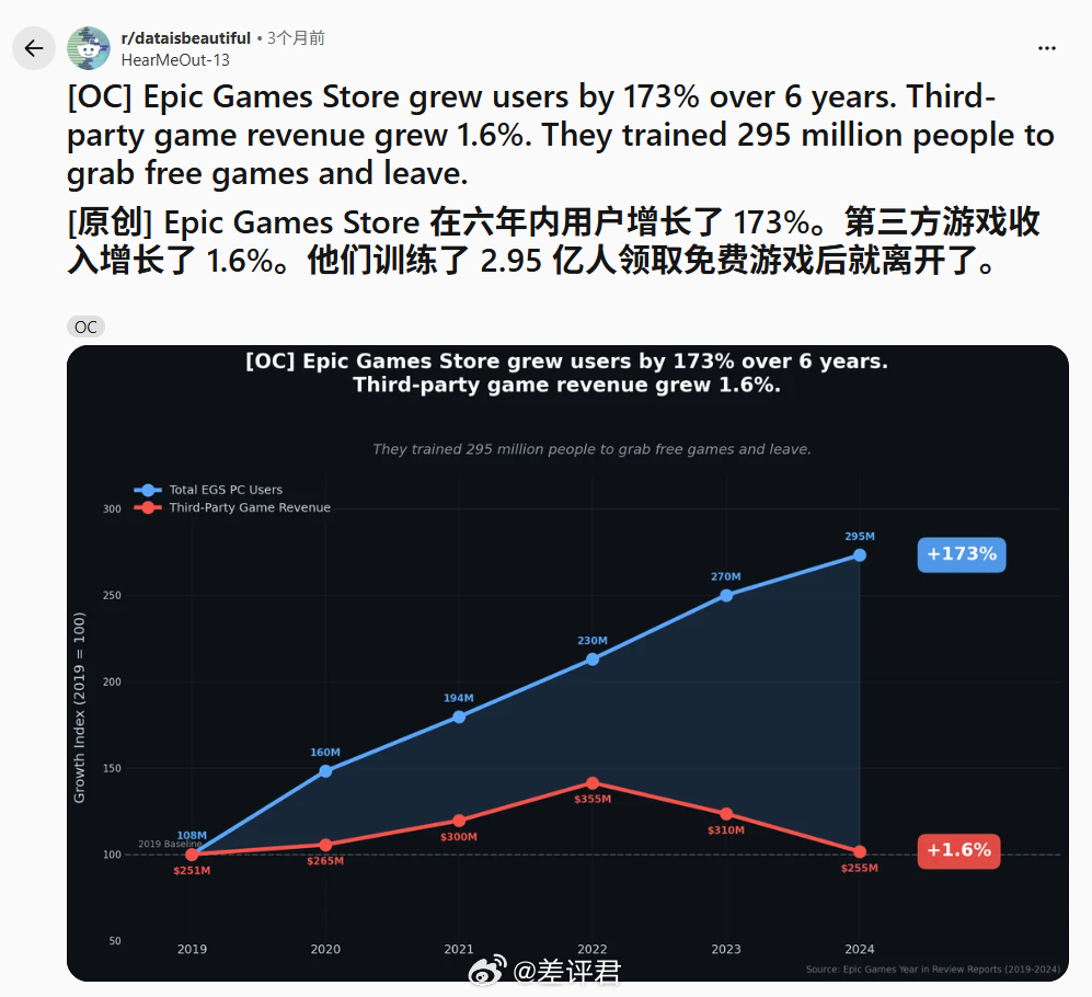 其实Epic最初的平台架构仅仅是为了支持 《堡垒之夜》和《虚幻争霸》而搭建,一开始没有想过未来会认真做,可能也没想过用户基数会起来的这么快。Steam靠社区生态和体验聚集流量,Epic则比较暴力,砸钱送游戏来聚集人气。所以Epic用户一直在暴涨,但大家却没有形成消费习惯。