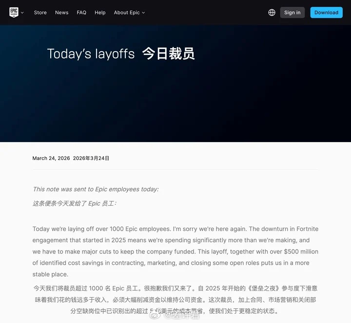 #Epic裁员E宝# Epic最近的大裁员引发不少争议。起初是一位妻子站出来发声,她丈夫在Epic工作了7年,目前正处于脑癌晚期,这次被裁让他失去了收入,连带失去公司提供的保险,当前保险终止后,他的癌症会变成既往病症,无法重新投保,后续生存面临很大问题。