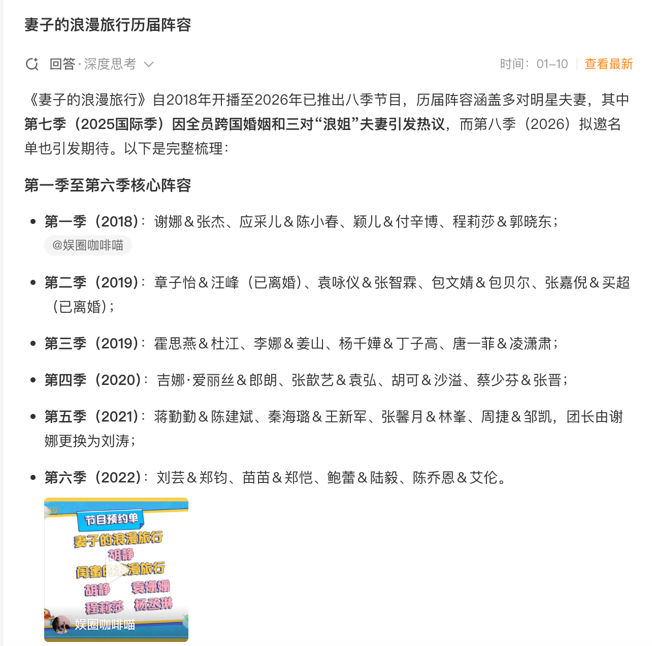 妻子的浪漫旅行历届阵容八季旅程,浪漫永存✨从初代夫妻的经典名场面,到国际季的跨国浪漫,再到第八季的全新出发,《妻子的浪漫旅行》用镜头定格无数温柔瞬间,永远为双向奔赴的爱情喝彩