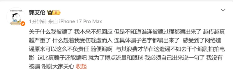今日郭艾伦发文回应被骗传言:感受到了网络造谣原来可以这么不负责任,我没有被骗,谢谢大家关心。