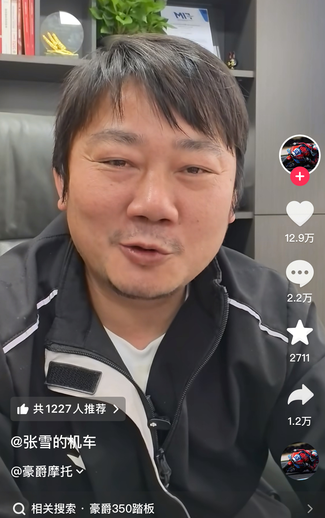 张雪突然发视频,力推豪爵踏板车。不知道豪爵能不能接住这波流量,看了一下官方账号,视频更新停留在一个月前,感觉后面几天有的忙了。