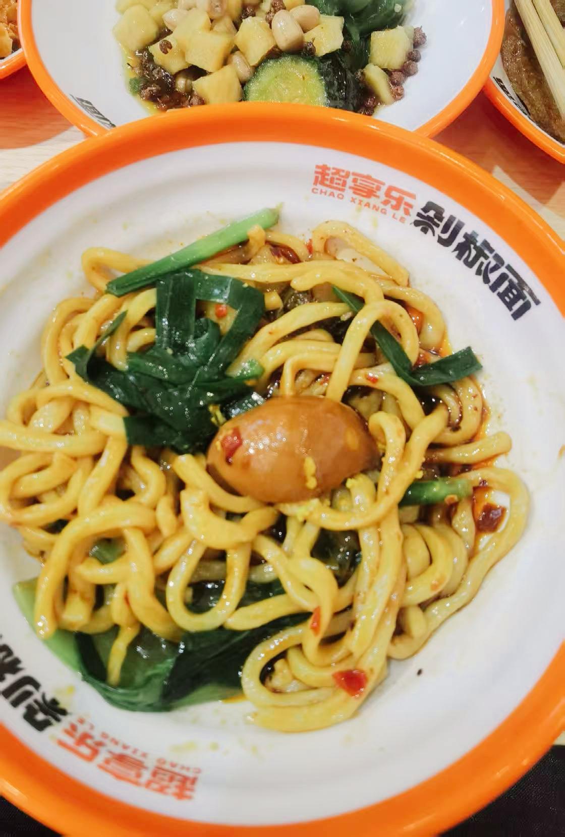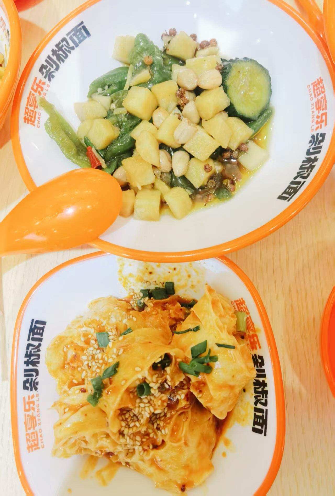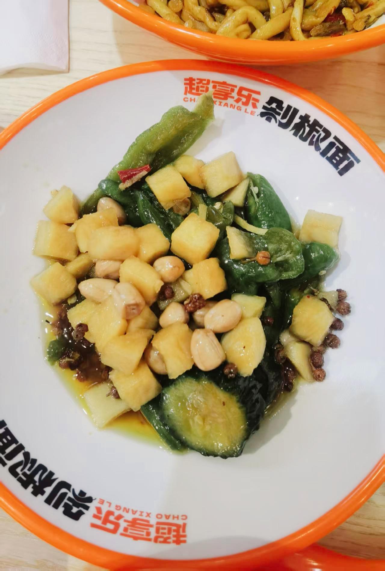 在咸阳,剁椒面现在也是有多家店,各大商超和饮食街都能看到分店!今天在吾悦广场闲逛,饭点时在负一层碰见家食客爆满的剁椒面店,和朋友就进来尝鲜。 朋友点了“土豆泥肉酱剁椒拌面”,一上桌就被那绵密的土豆泥吸引了,她说泥酱裹着面条特别入味,口感醇厚,每一口都超满足。我要的还是招牌剁椒面,辣度刚刚好,面条劲道,剁椒的香味,还是那个熟悉的味道!最让我两惊喜的是泡椒素拼,辣椒和萝卜丁酸酸甜甜的,还辣辣的,吃起来嘎嘣脆,特别爽口。还有麻酱面藕,吸满了麻酱的香味,软糯又入味,配着这些一起吃,各种味道一下子齐全了! 纯粹偶然来到这家店,感觉味道一点不输我去过的几家剁椒店,小伙服务也特别虔诚,不停地询问是否还免费加面。下次来吾悦一定还会光顾,超享乐! 晒出你的本地生活速食剁椒面