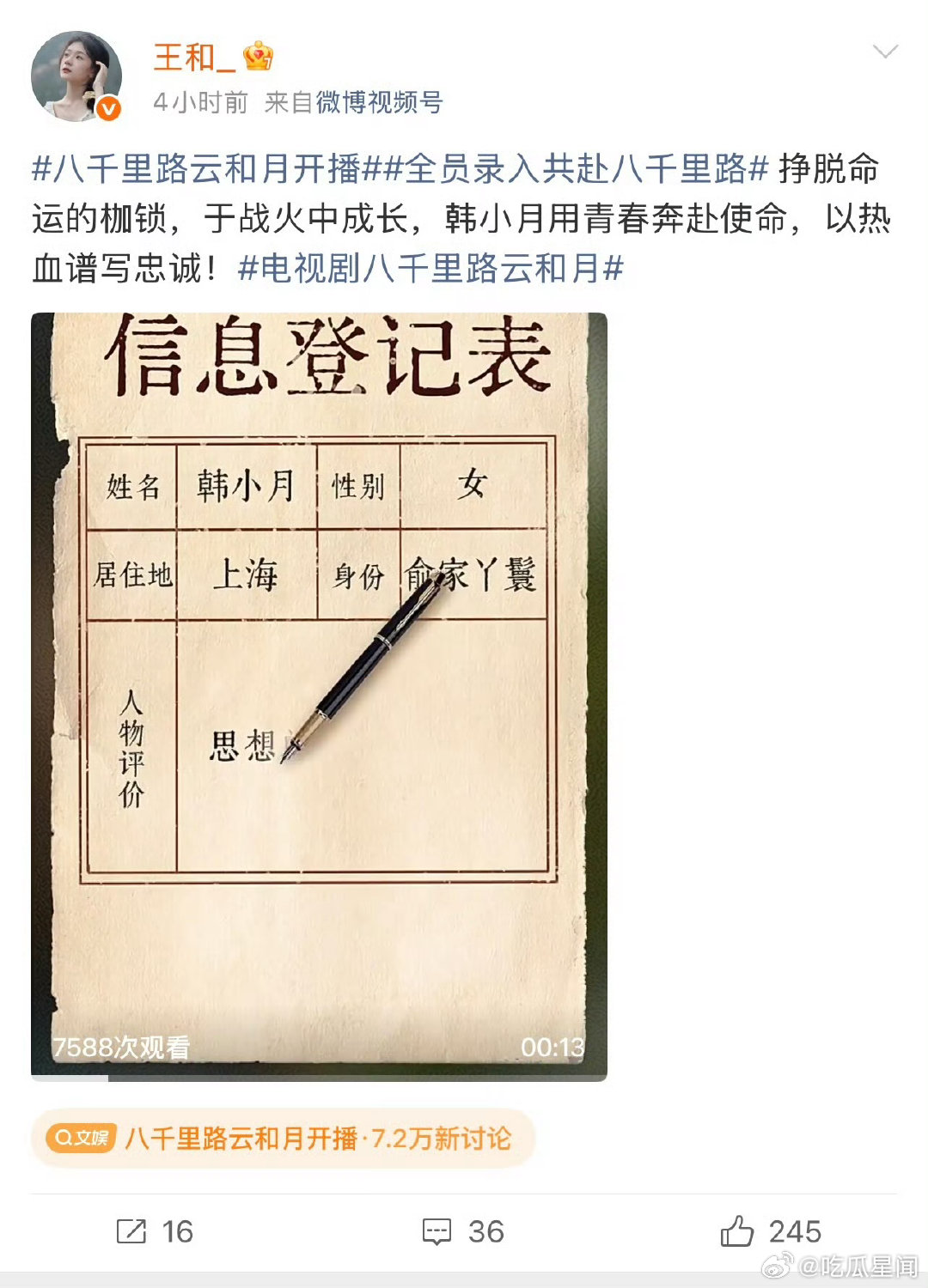 王和演绎乱世佳人八千里路云和月开播 王和饰演的韩小月是乱世里的一块锦!布衣是素色的面,坚定是里头的纹,温柔绣在上面,风一吹就露出藏不住的韧。开播这刻,剧情里的风雨仿佛都绕着她走,那份在乱世里扎根的劲儿,看得人心里又暖又提气,必须追下去!