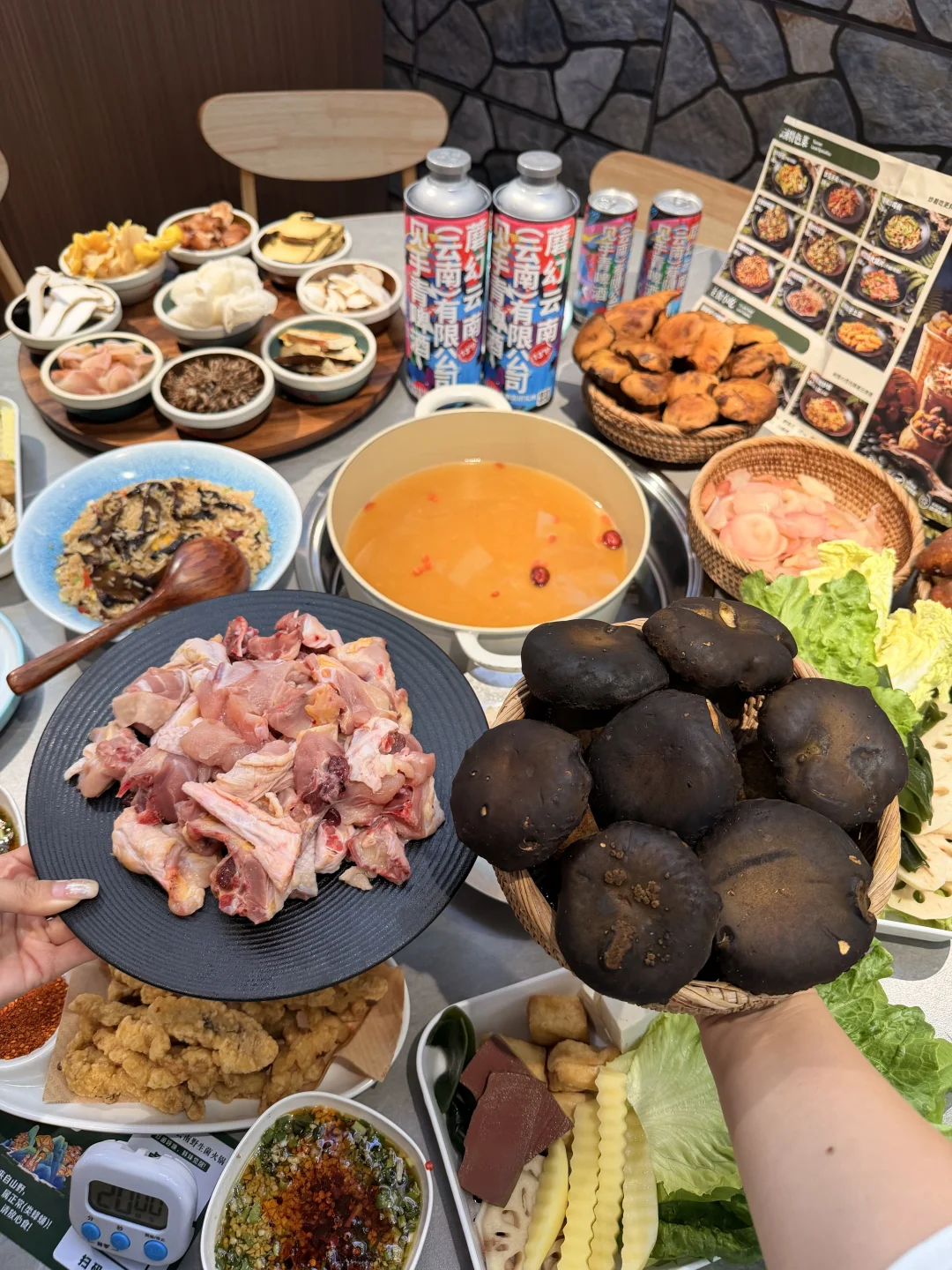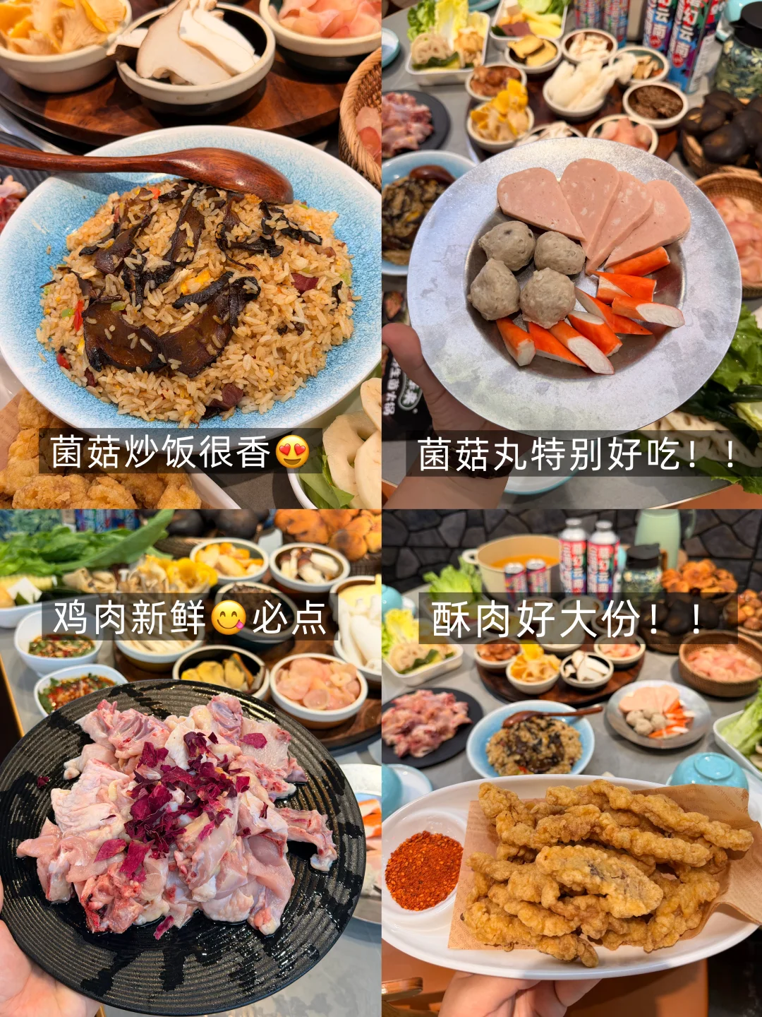 煮出来的汤特别浓郁又鲜美!鸡肉看的到的新鲜,菌菇丸要点(因为很好吃),牛肝菌蛋炒饭必点,很香!!粒粒分明,我吃了两碗😋!!酥肉分量也大👍🏻,青菜是自助的(选择多又解腻),调料台有我爱的则耳根!!