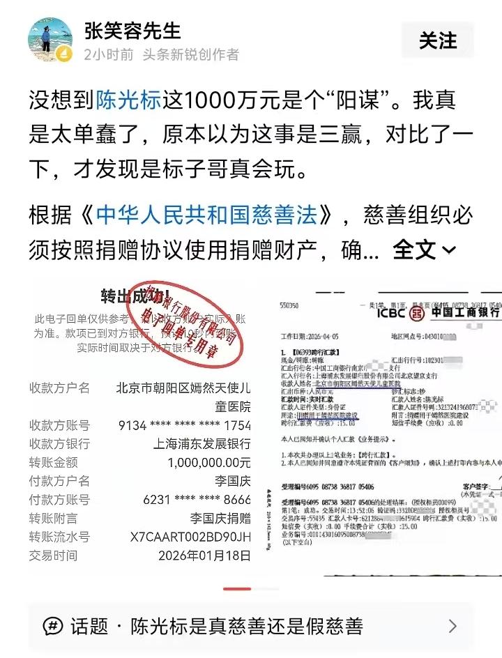 从夺冠到赠车到捐款,这一波三折的故事,把三个真男人联系到一起。在世界超级摩托车锦标赛上夺冠的张雪,或高调或低调做慈善的陈光标和李亚鹏。实话,对这三个男人,我还真的没有资格去评价,只有佩服。 张雪在世界超级摩托车锦标赛上夺冠,可以去看看他的故事,那绝对是普通人的励志传奇。李亚鹏的嫣然天使医院,帮助了多少孩子感动了多少人,这也不用赘述。而能引起争议的可能是陈光标先生,也就是标哥。可能很多人不太看得惯他高调做慈善,但我觉得,不管是高调还是低调,只要是真正做慈善,只要没有伪捐诈捐,只要帮助到真正需要帮助的人,我在内心深处都是佩服的。标哥之所以如此高调做慈善,我相信它是以真金白银为底气,是在做真慈善,不怕你质疑,也不怕你去查。就这一点,我就是佩服的。 这件事情应当告一段落了,上午还有很多人发帖子质疑陈光标的捐款,现在嫣然医院已经回复了,这捐款是真的到位了,至于怎么用,我相信李亚鹏先说陈光标先生会去沟通。张雪也回复了,标哥是真男人。 这真的是三个真男人,中国男人界的一股清流。