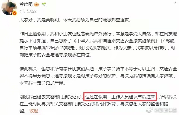 之前带未满12岁的小海绵骑车被指出违规,他第一时间诚恳道歉,假期刚结束第一天就立马赴队处理,知错就改、行动力拉满。黄晓明现身交警队