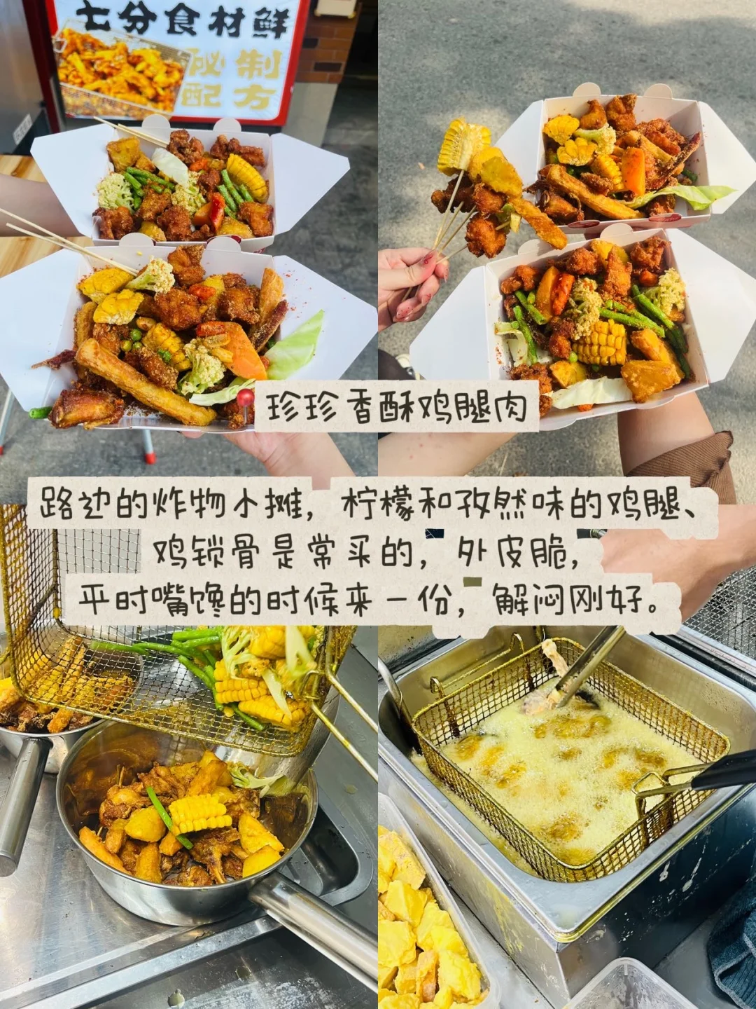 路边的炸物小摊,柠檬和孜然味的鸡腿、鸡锁骨是常买的,外皮脆,平时嘴馋的时候来一份,解闷刚好。