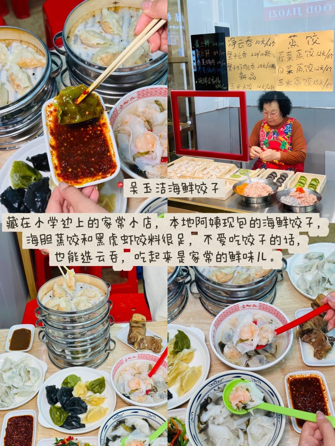 藏在小学边上的家常小店,本地阿姨现包的海鲜饺子,海胆蒸饺和黑虎虾饺料很足,不爱吃饺子的话,也能选云吞,吃起来是家常的鲜味儿。