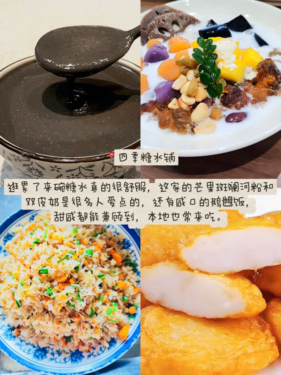 逛累了来碗糖水真的很舒服,这家的芒果斑斓河粉和双皮奶是很多人爱点的,还有咸口的鹅乸饭,甜咸都能兼顾到,本地也常来吃。