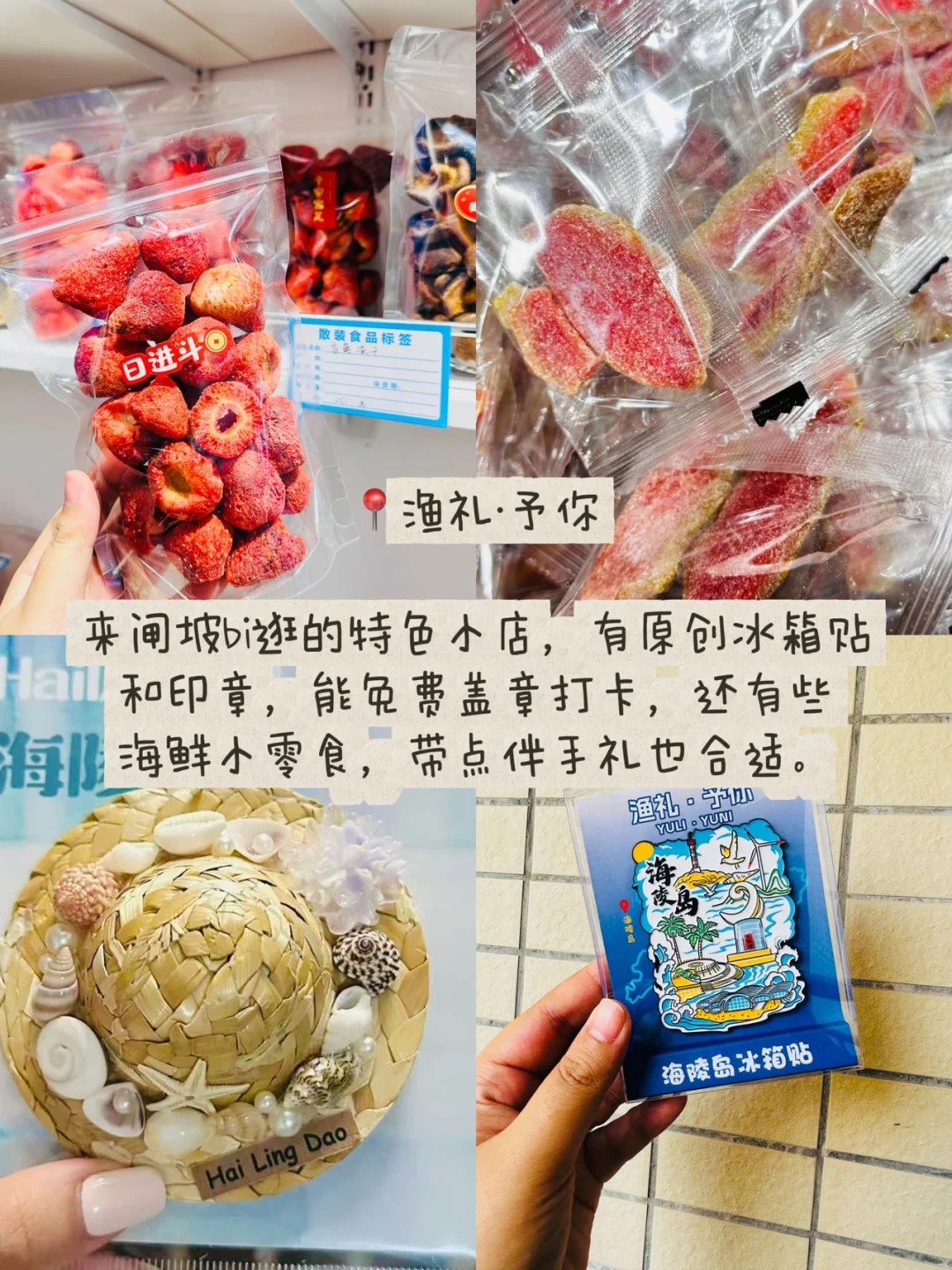来闸坡bi逛的特色小店,有原创冰箱贴和印章,能免费盖章打卡,还有些海鲜小零食,带点伴手礼也合适。