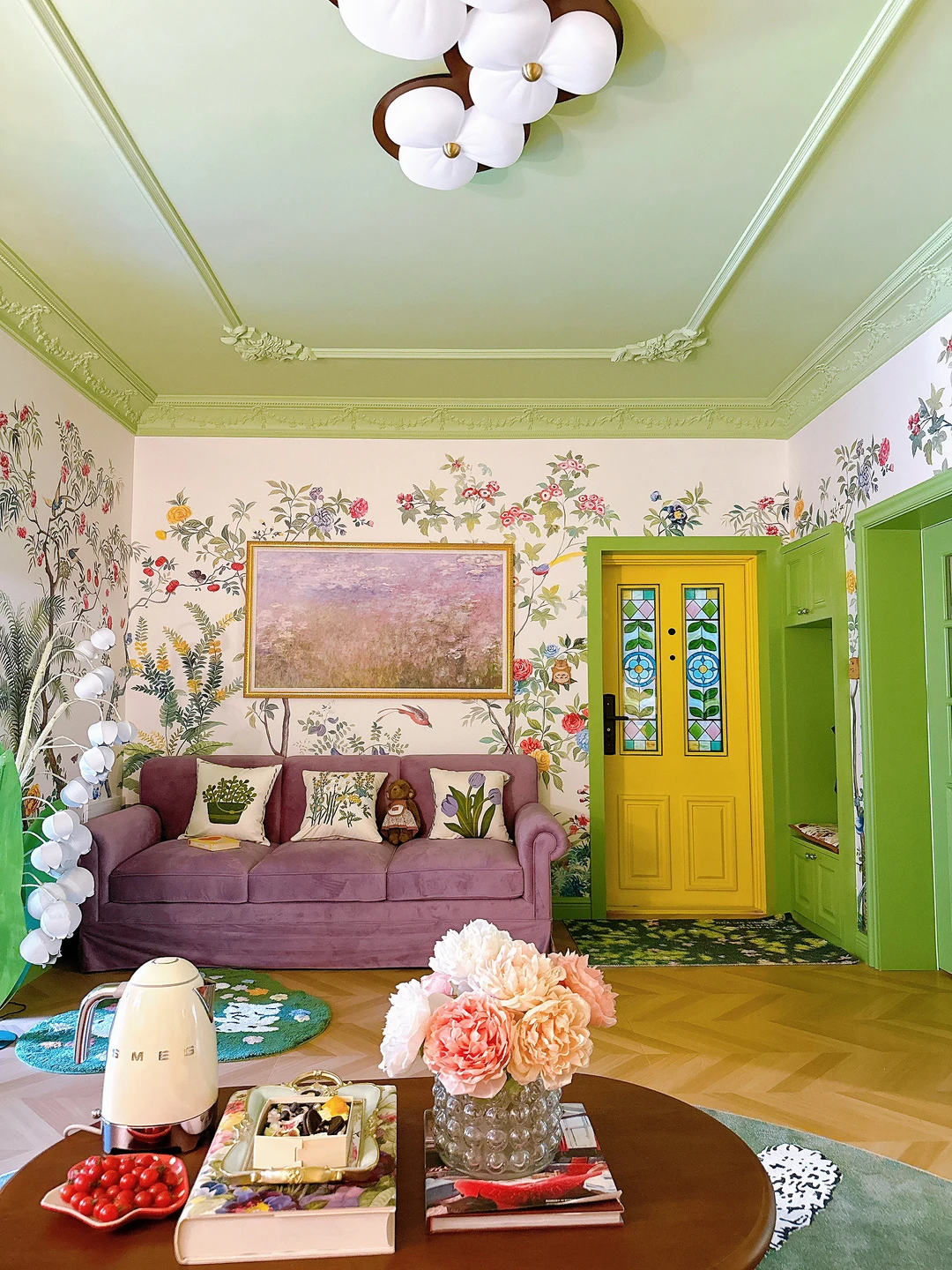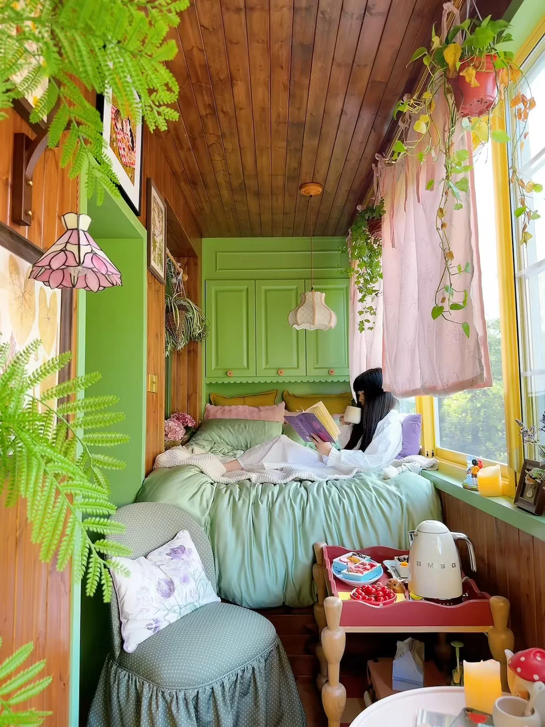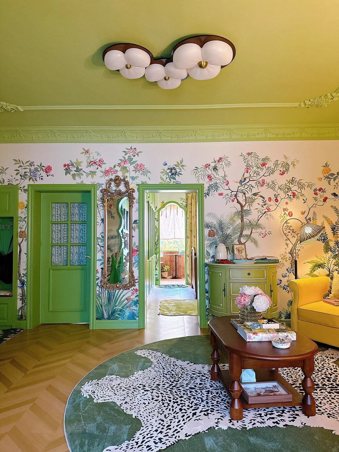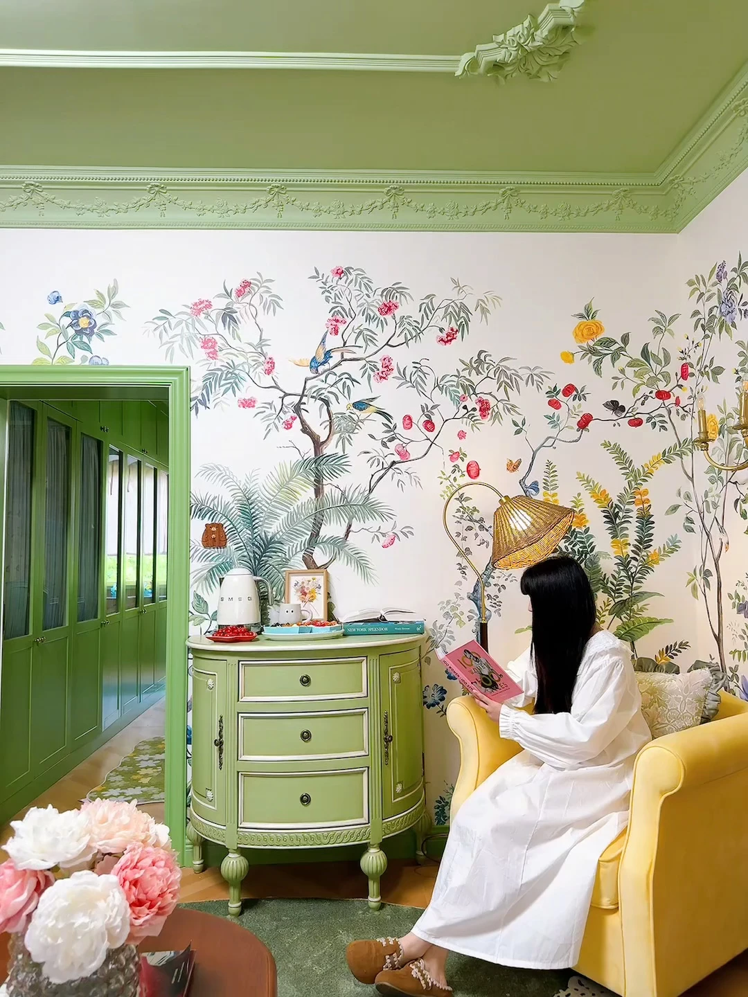 我给家里搭配了超有质感的木质家具,深棕色调中和了绿色的清新,复古感直接拉满。墙面手绘的花鸟墙纸精致又灵动,每一处细节都藏着小心思,仿佛置身在充满自然气息的秘境里🌿